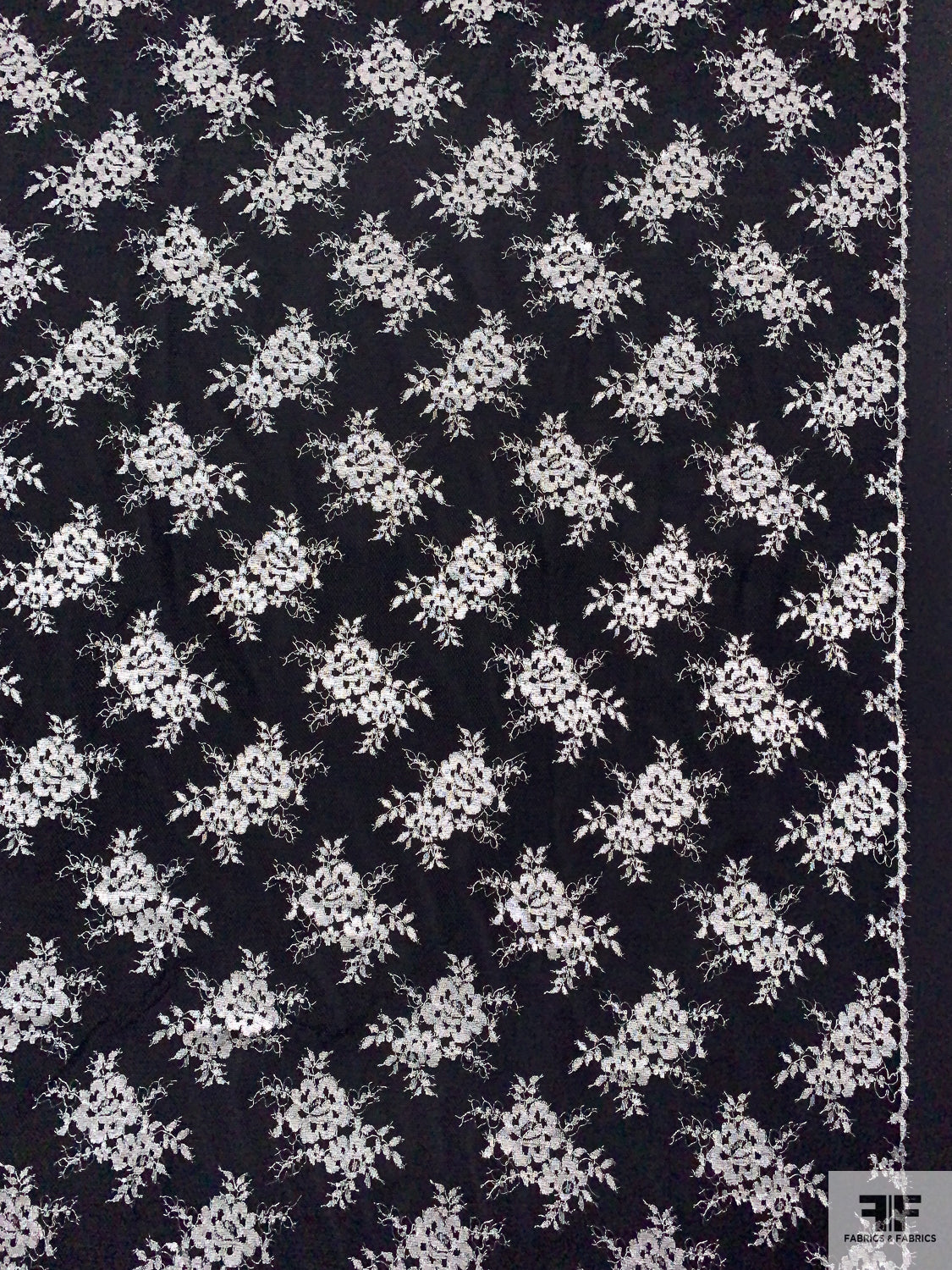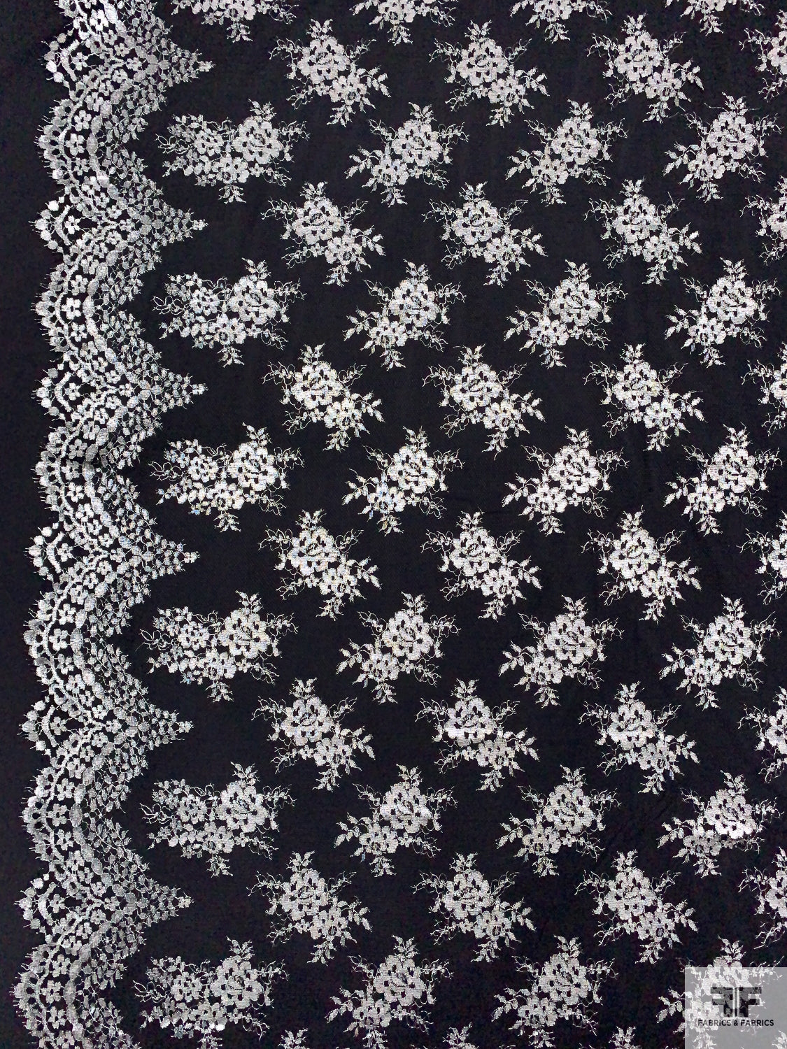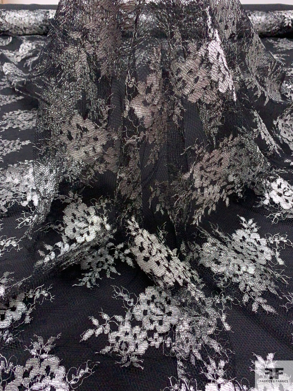 Single Scalloped Floral Metallic French Chantilly Lace - Silver / Black
