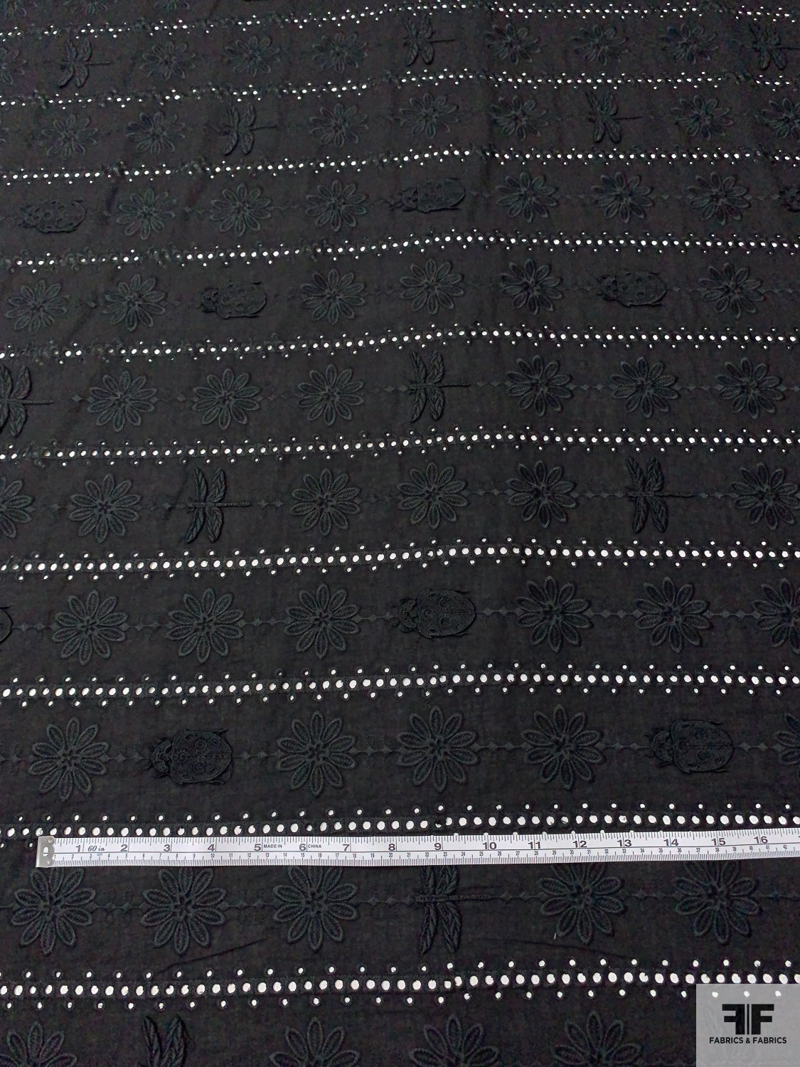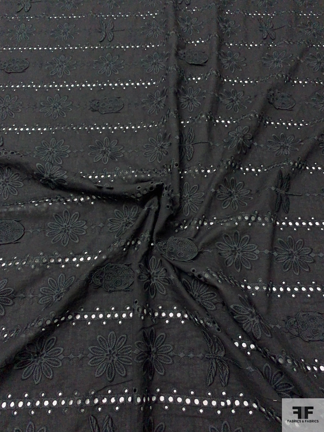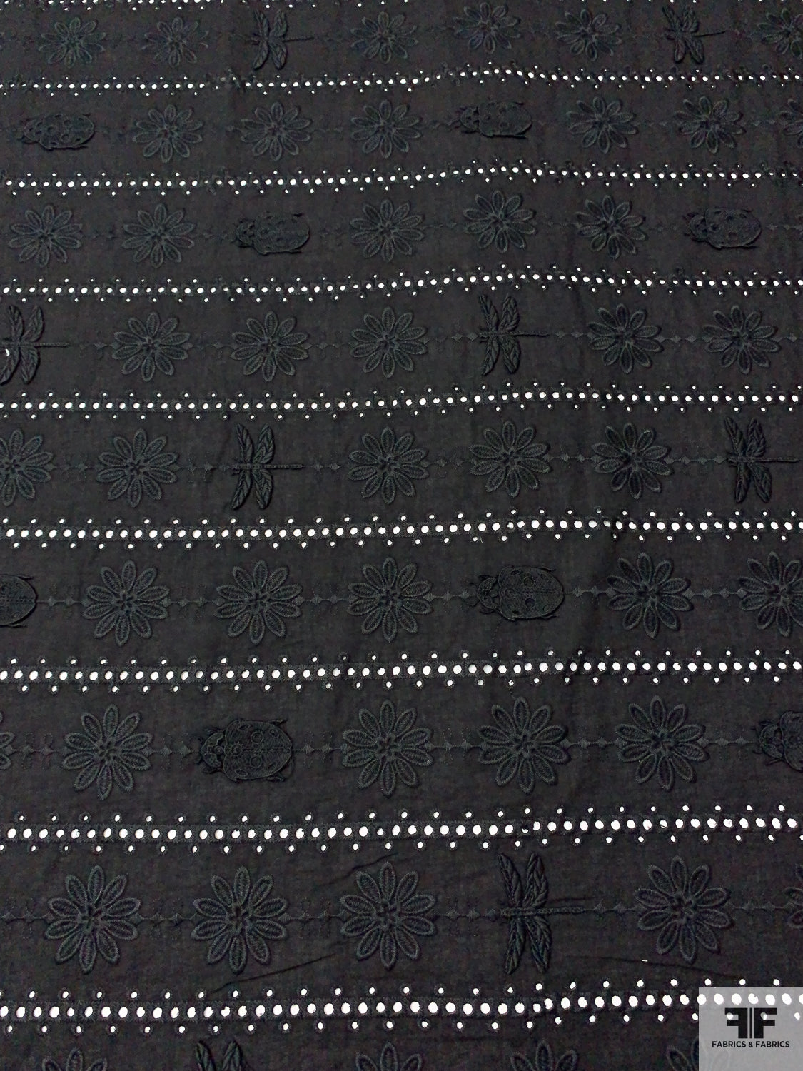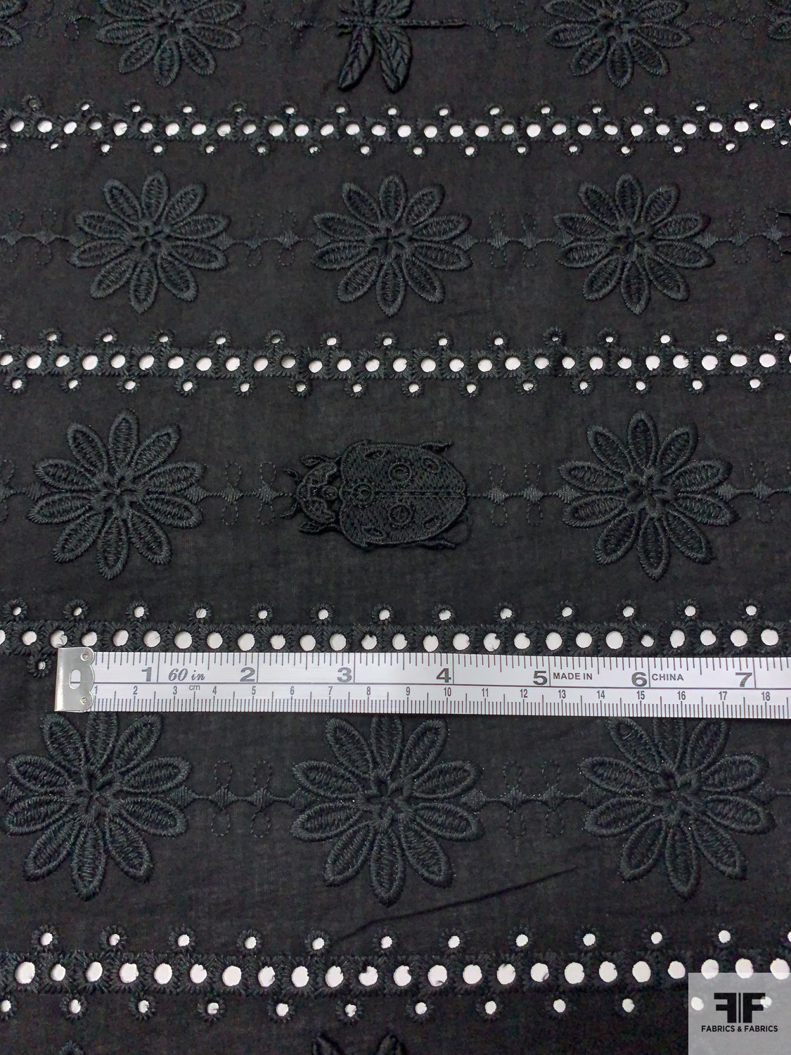 3D Appliquéd Ladybugs and Floral Embroidered Eyelet Cotton Lawn - Black