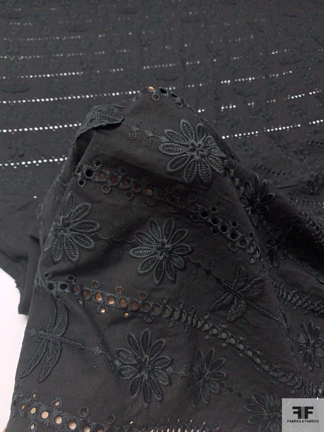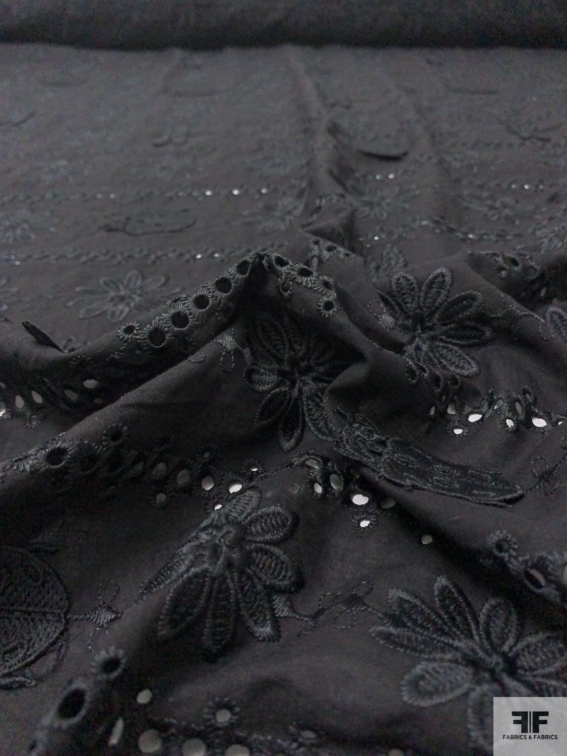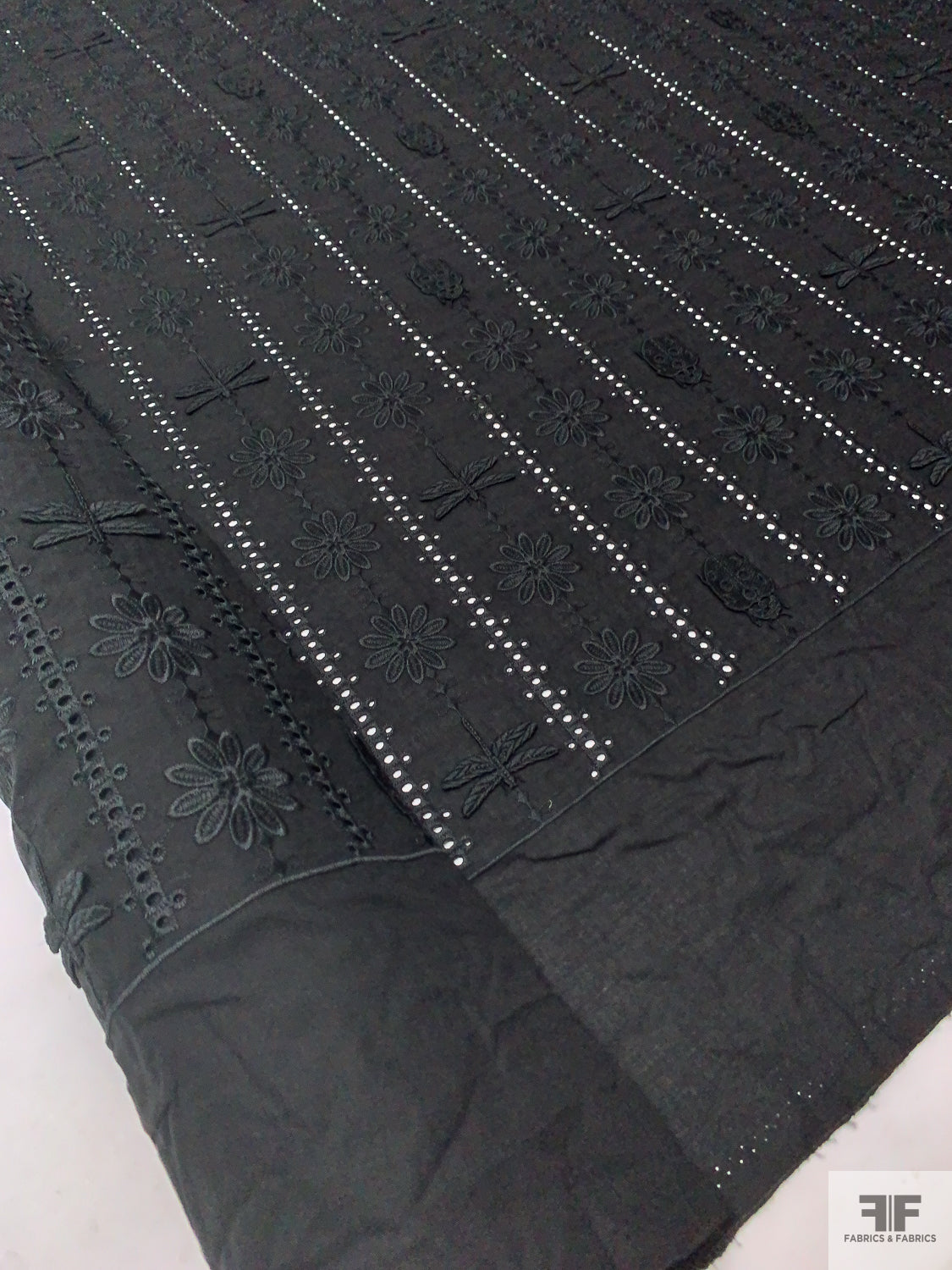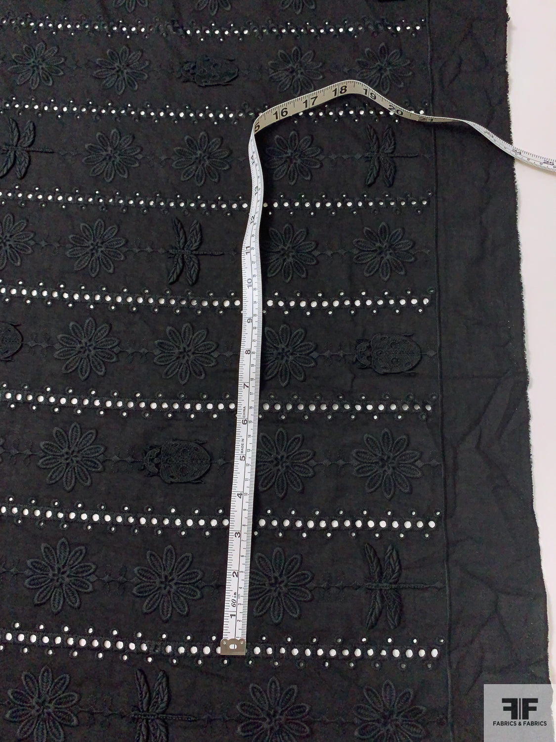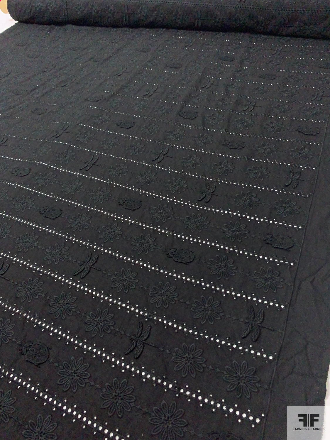 3D Appliquéd Ladybugs and Floral Embroidered Eyelet Cotton Lawn - Black