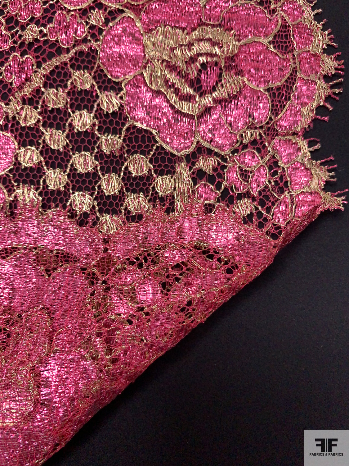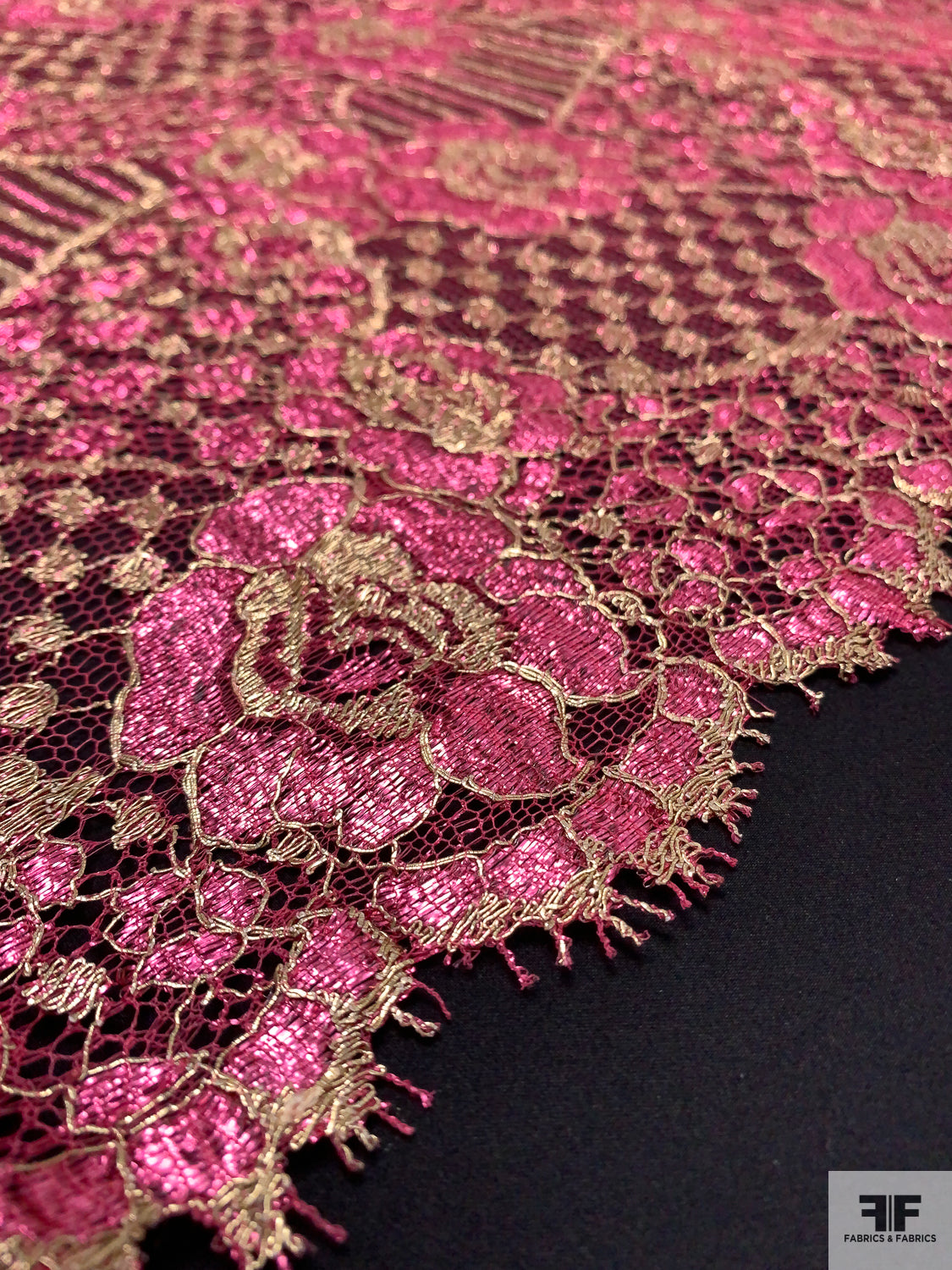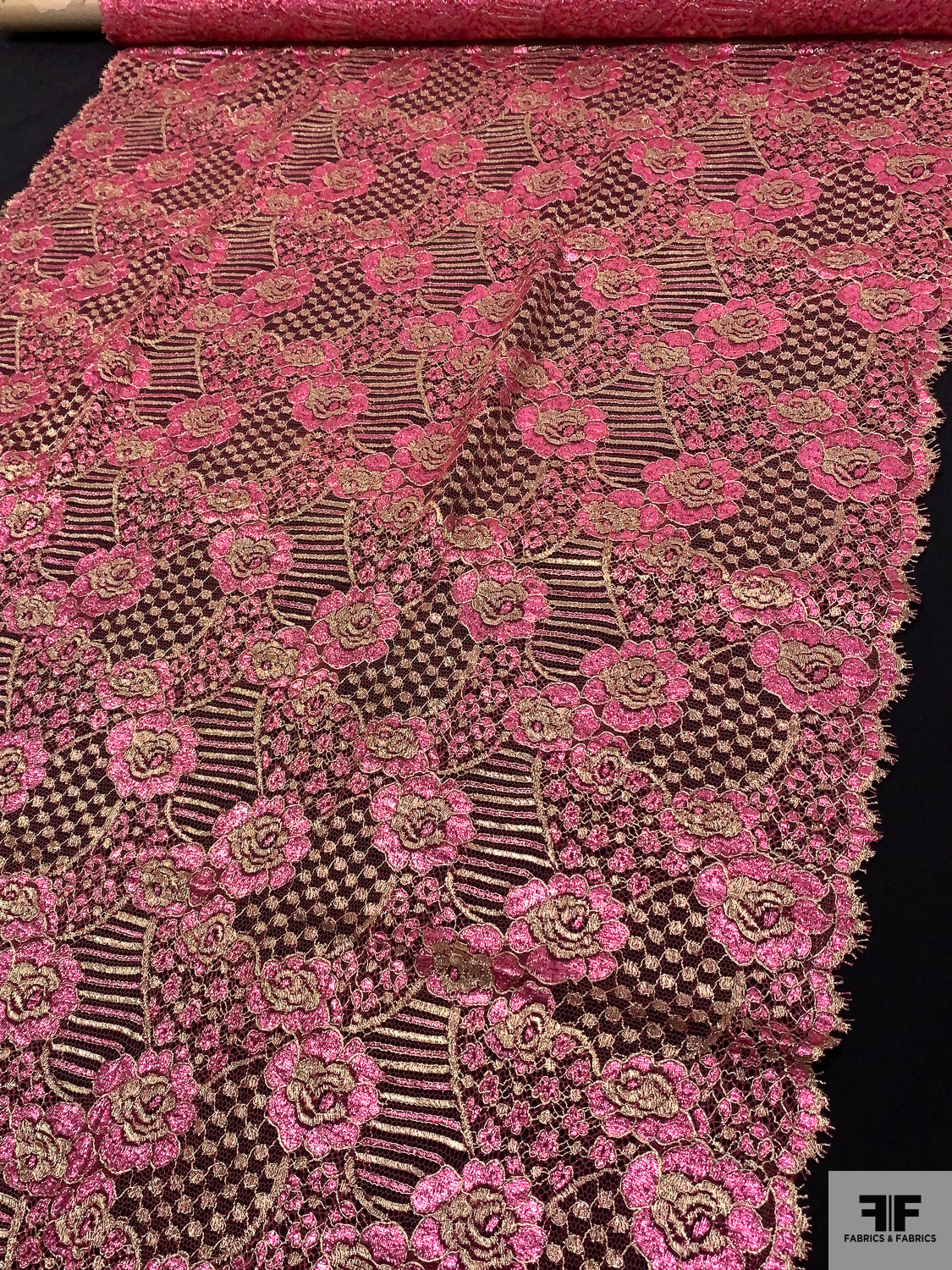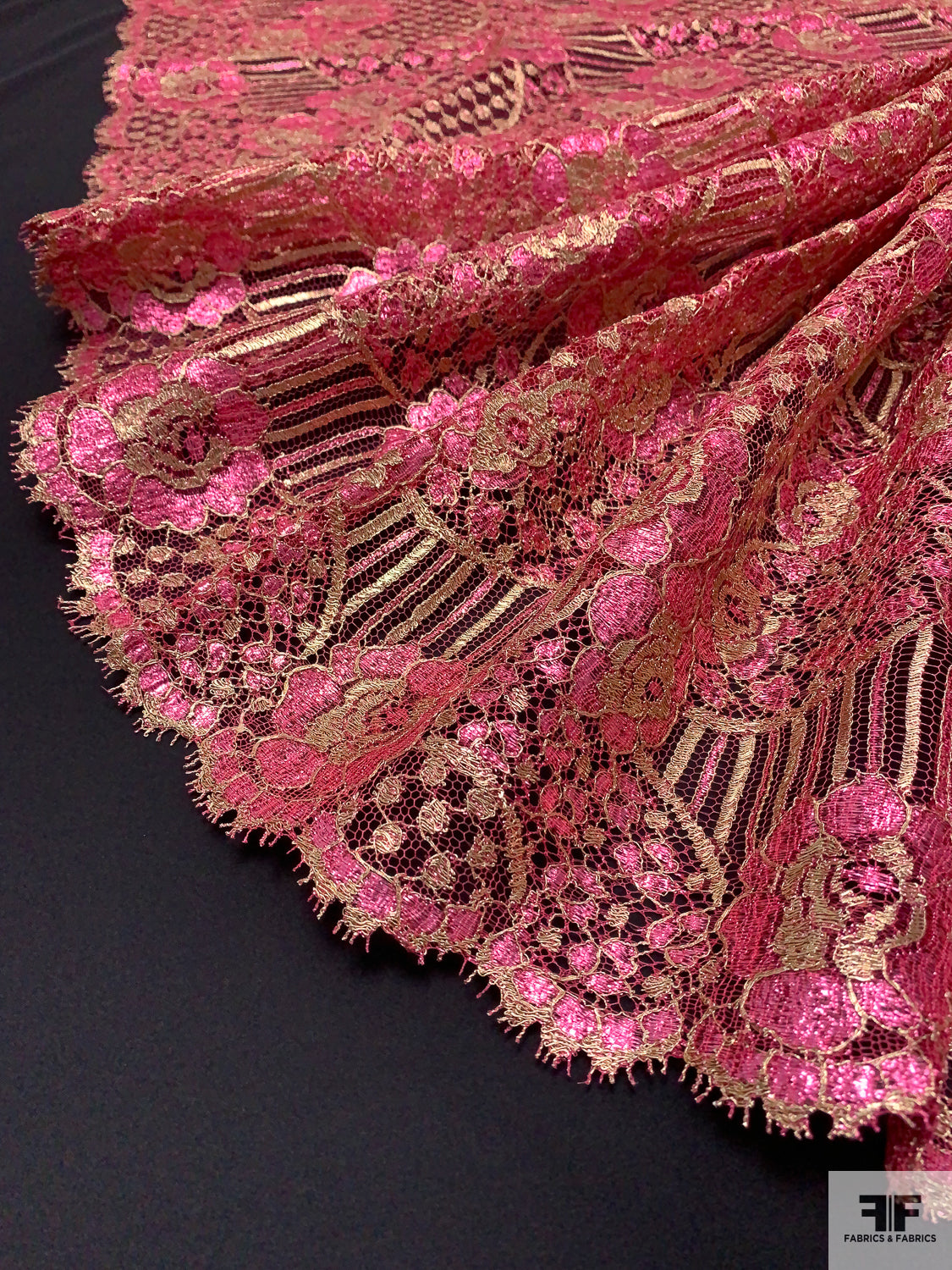Double Scalloped Floral Metallic French Chantilly Lace - Metallic Deep Pink / Gold