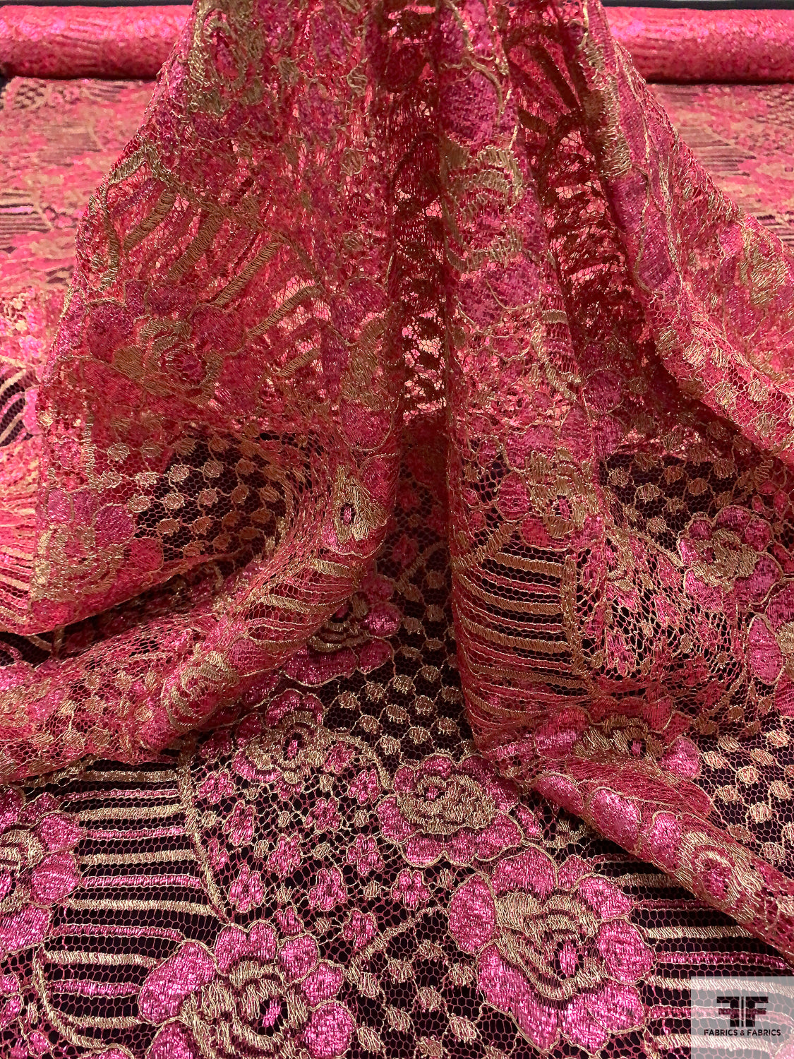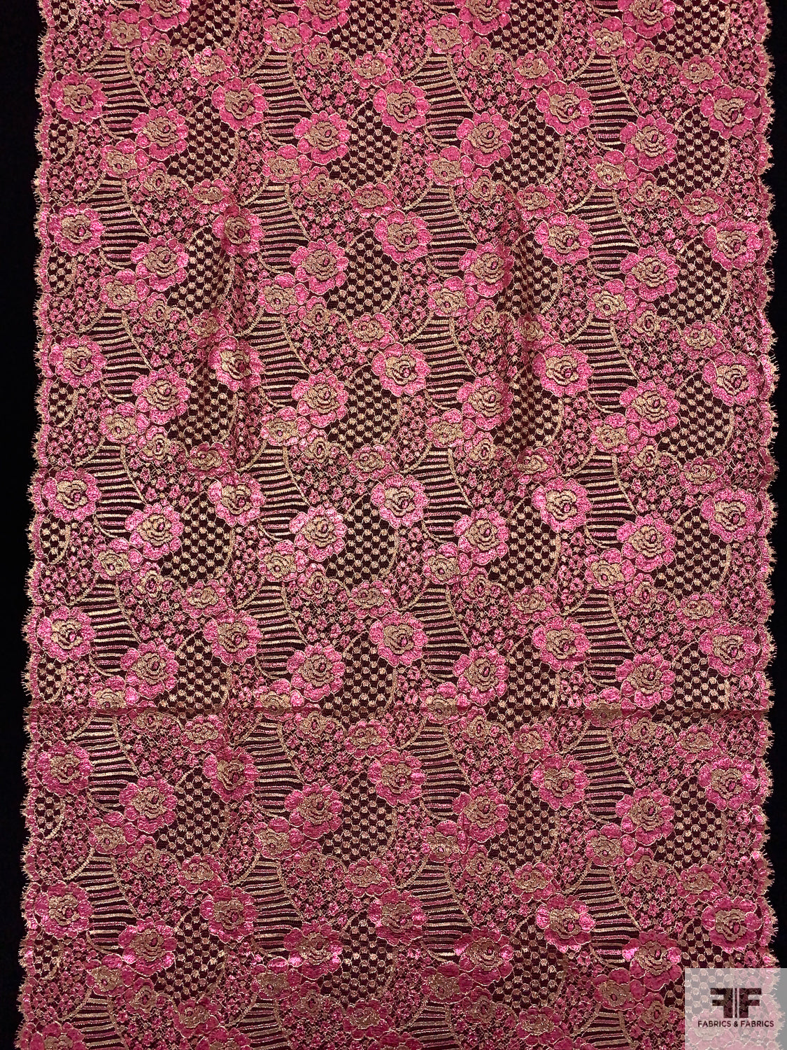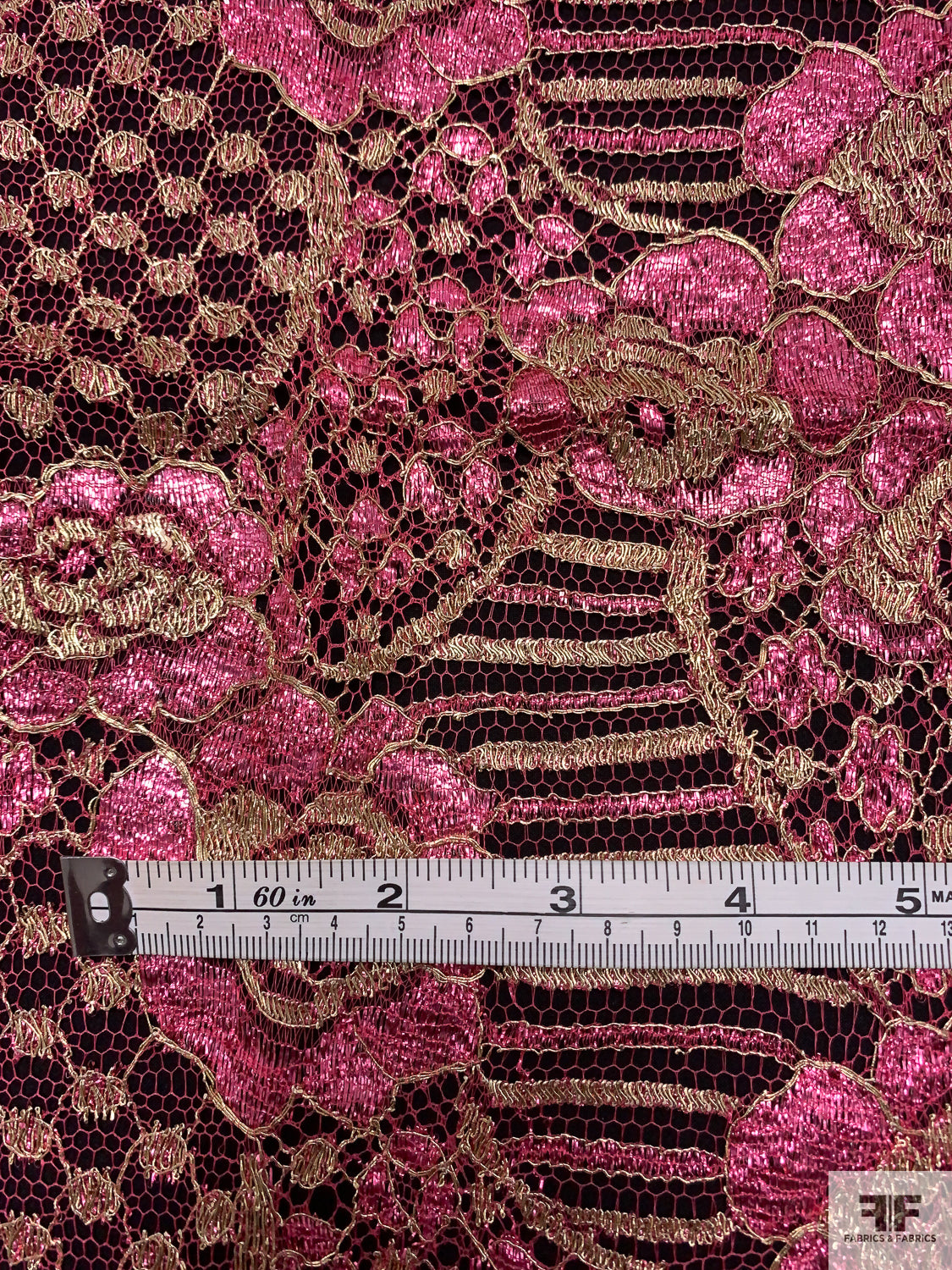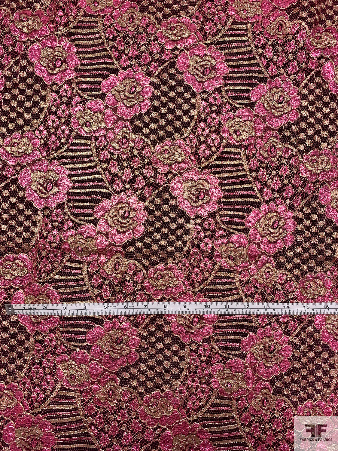Double Scalloped Floral Metallic French Chantilly Lace - Metallic Deep Pink / Gold