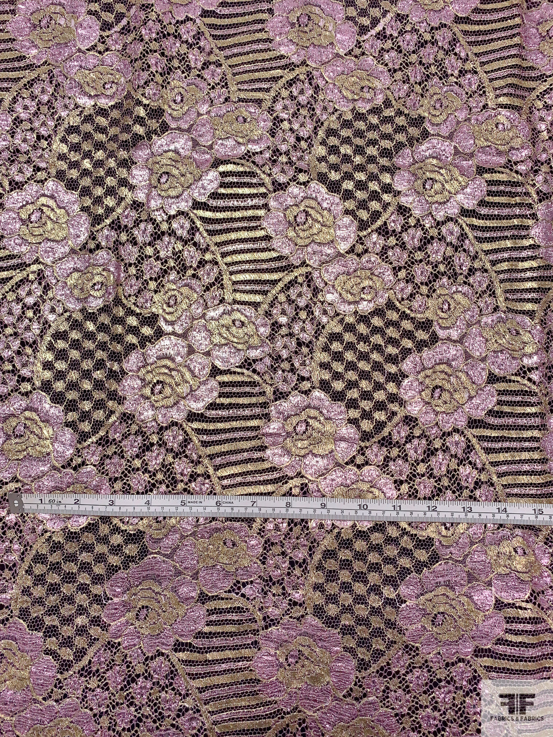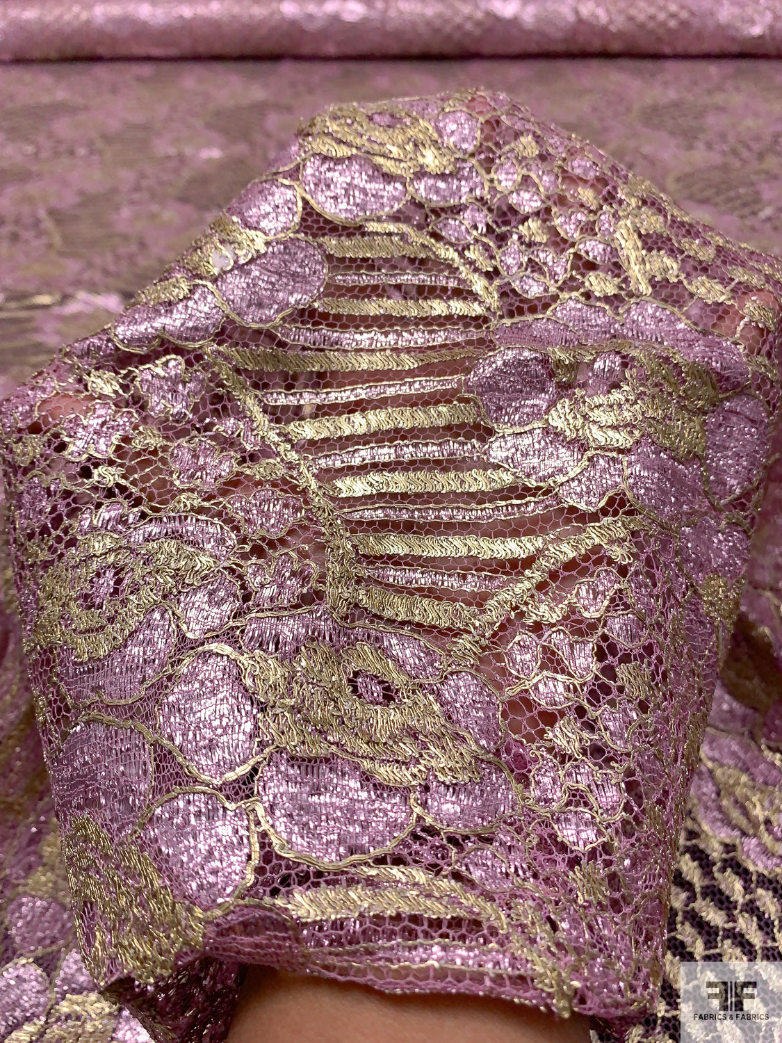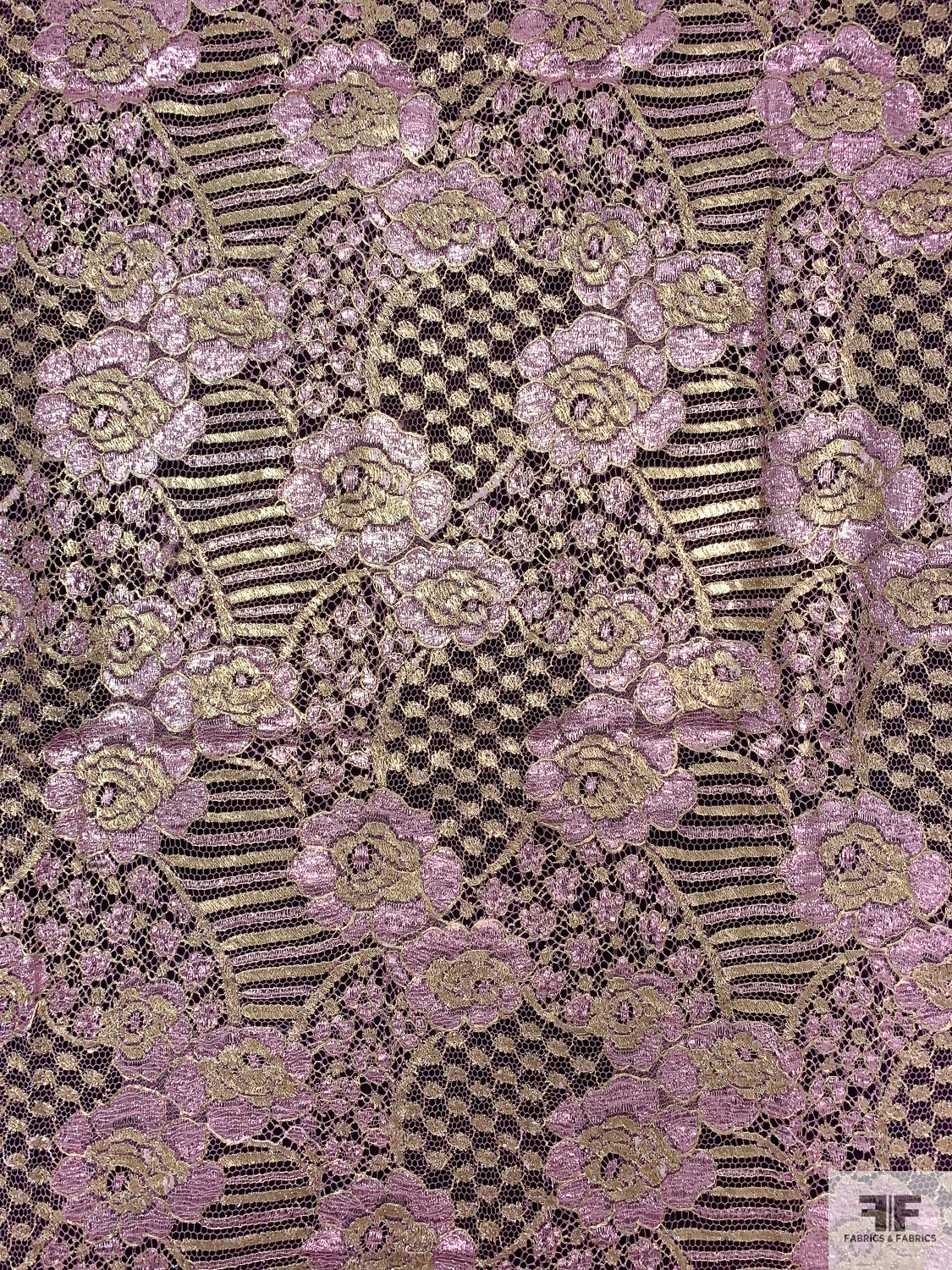 Double Scalloped Floral Metallic French Chantilly Lace - Metallic Lilac-Pink / Gold