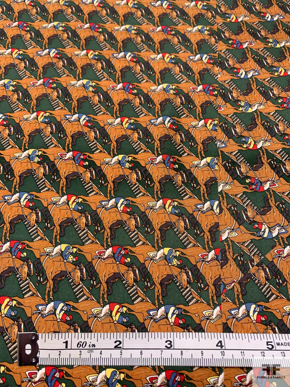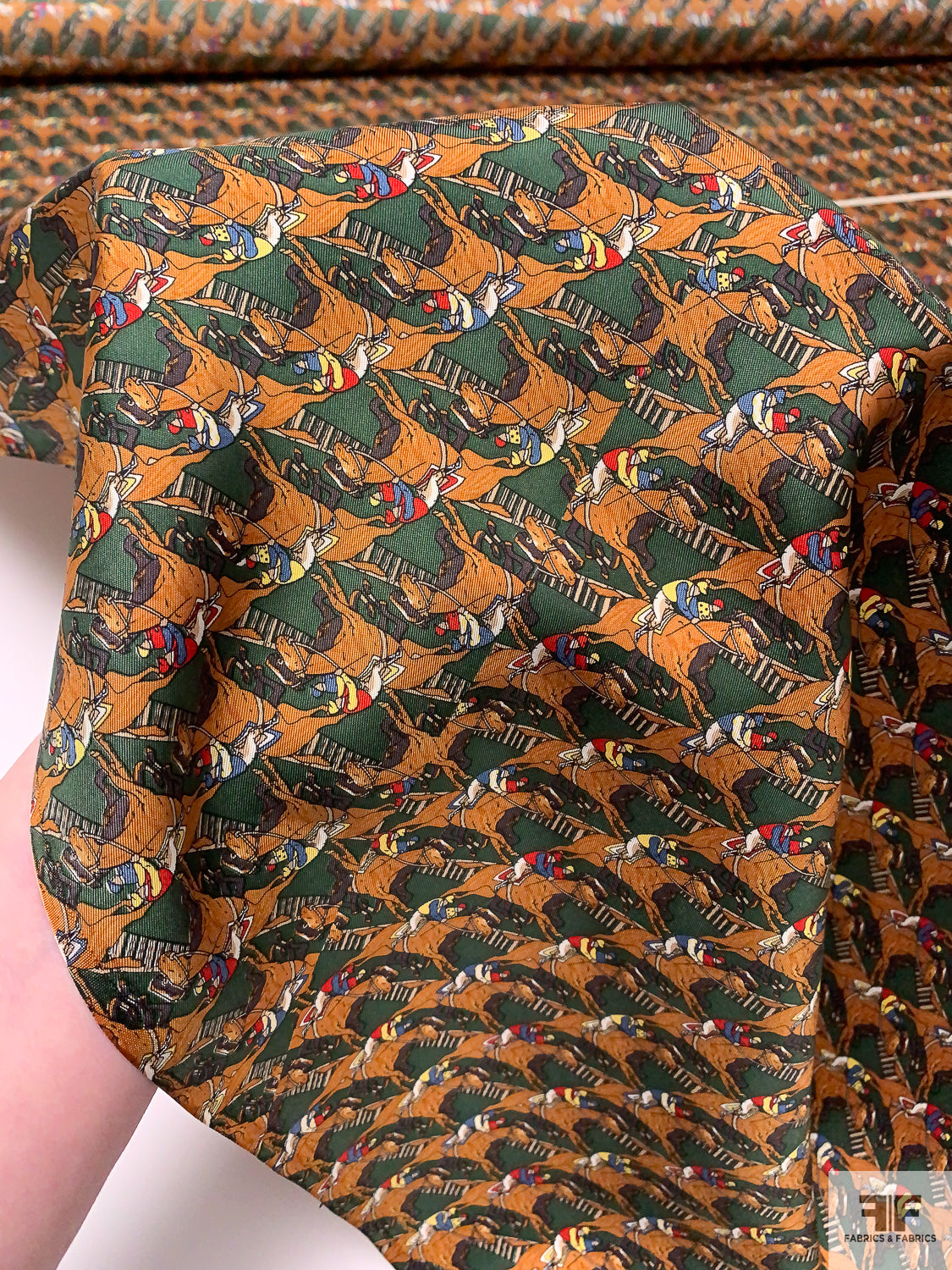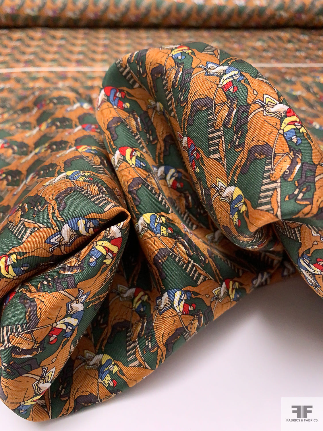 Equestrian Jockey Printed Fine Silk Twill Panel - Sweet Basil / Caramel Tan / Red