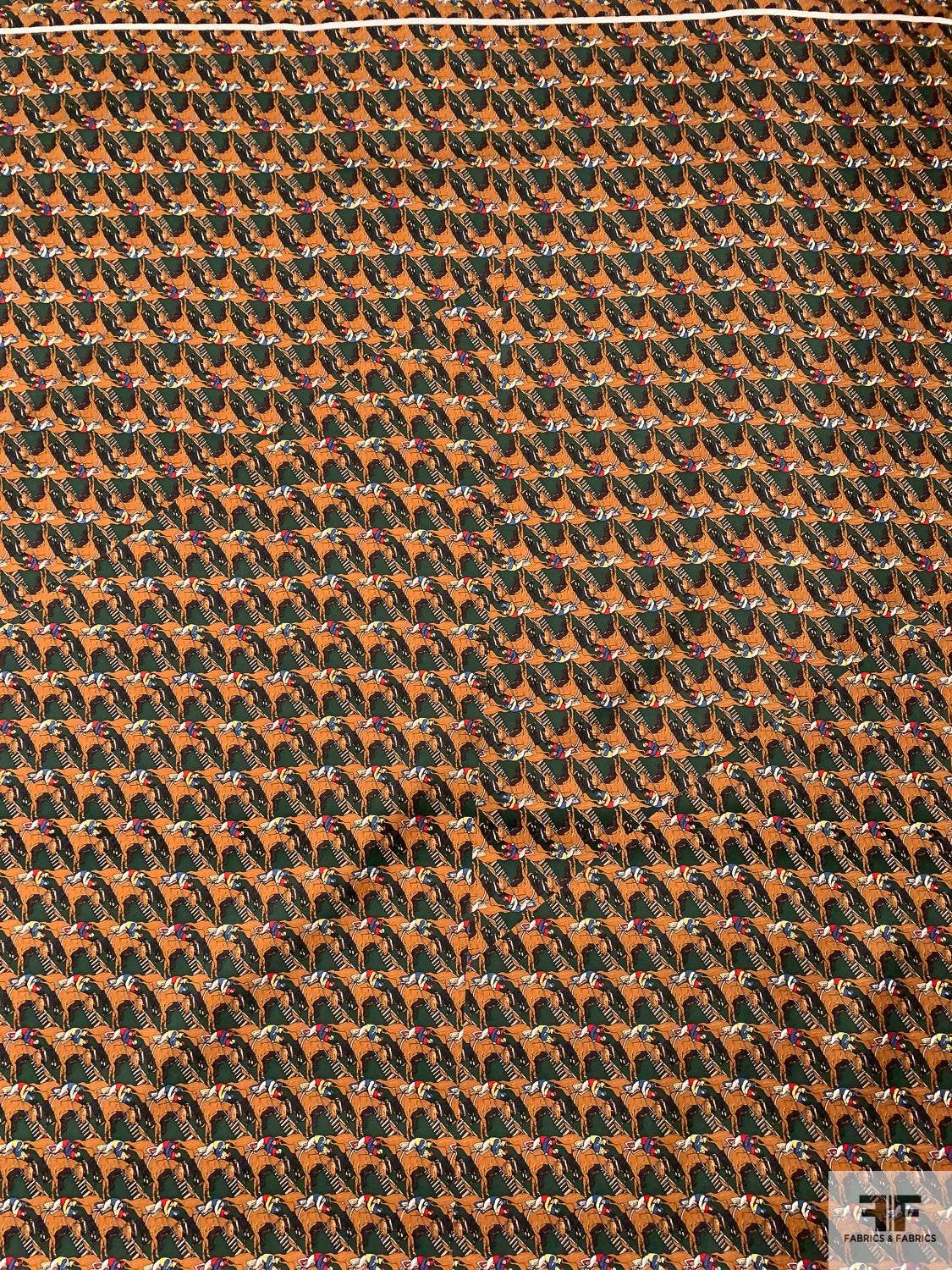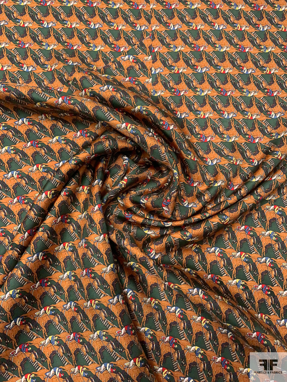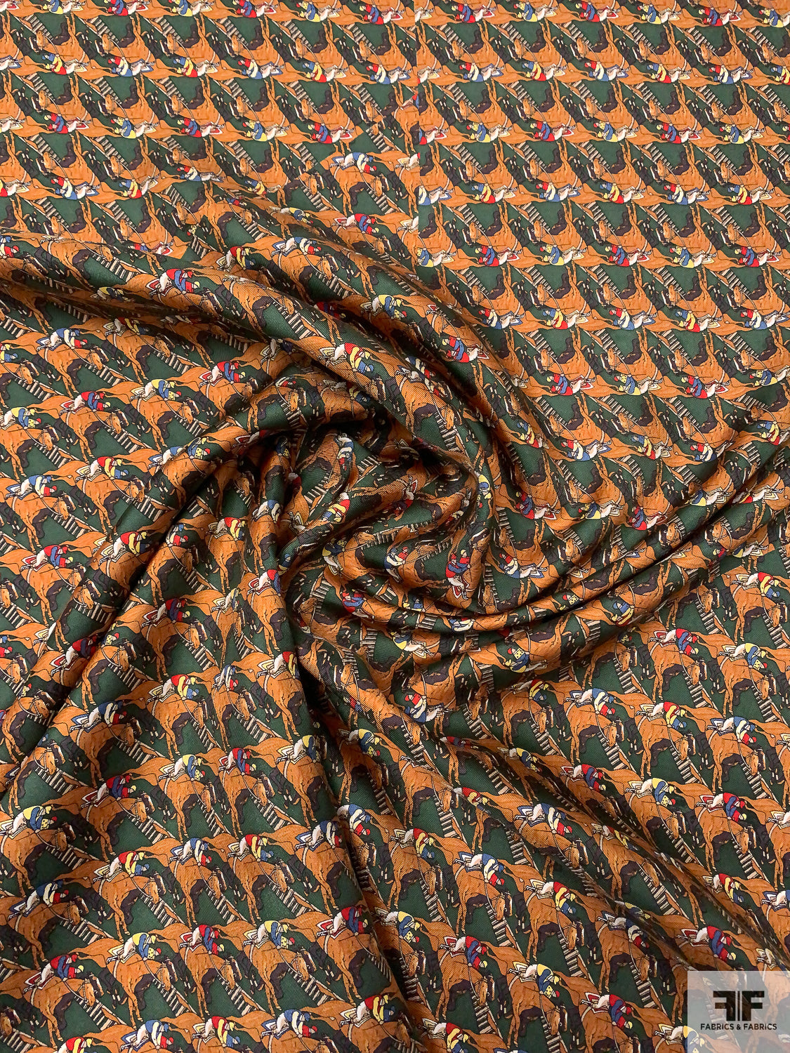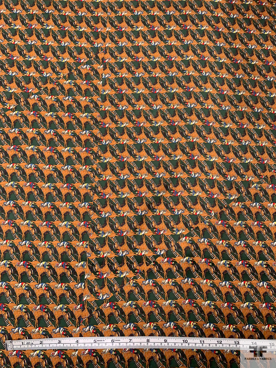 Equestrian Jockey Printed Fine Silk Twill Panel - Sweet Basil / Caramel Tan / Red