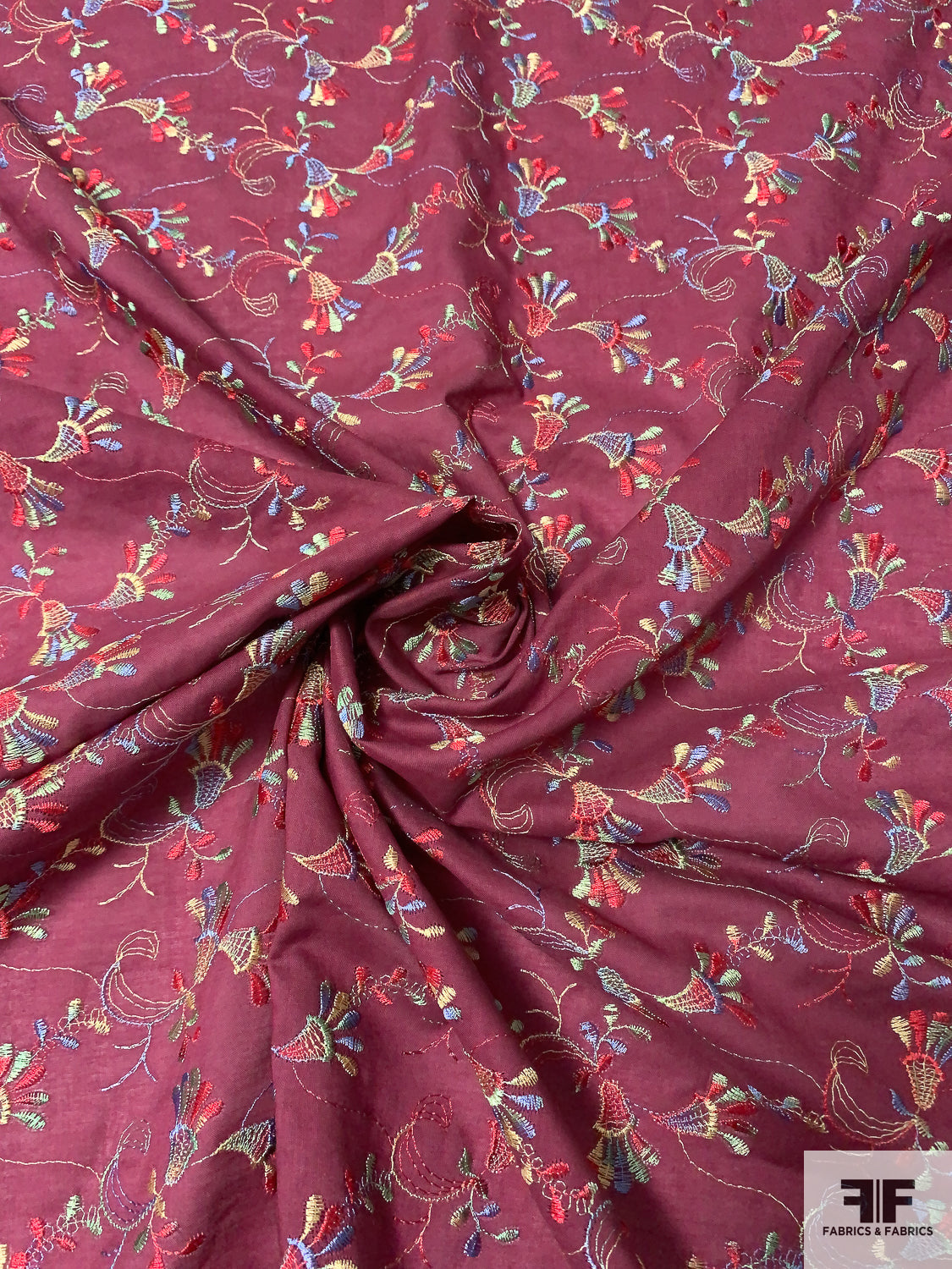 Festive Floral Embroidered Cotton Voile - Sangria Purple / Multicolor