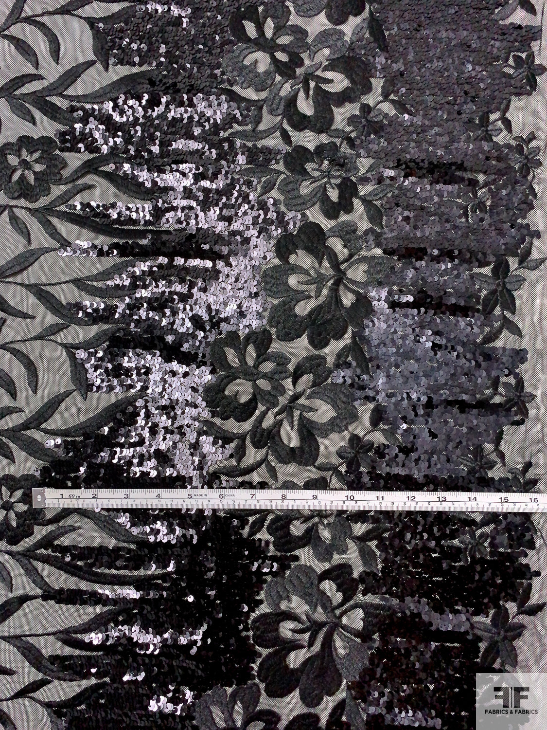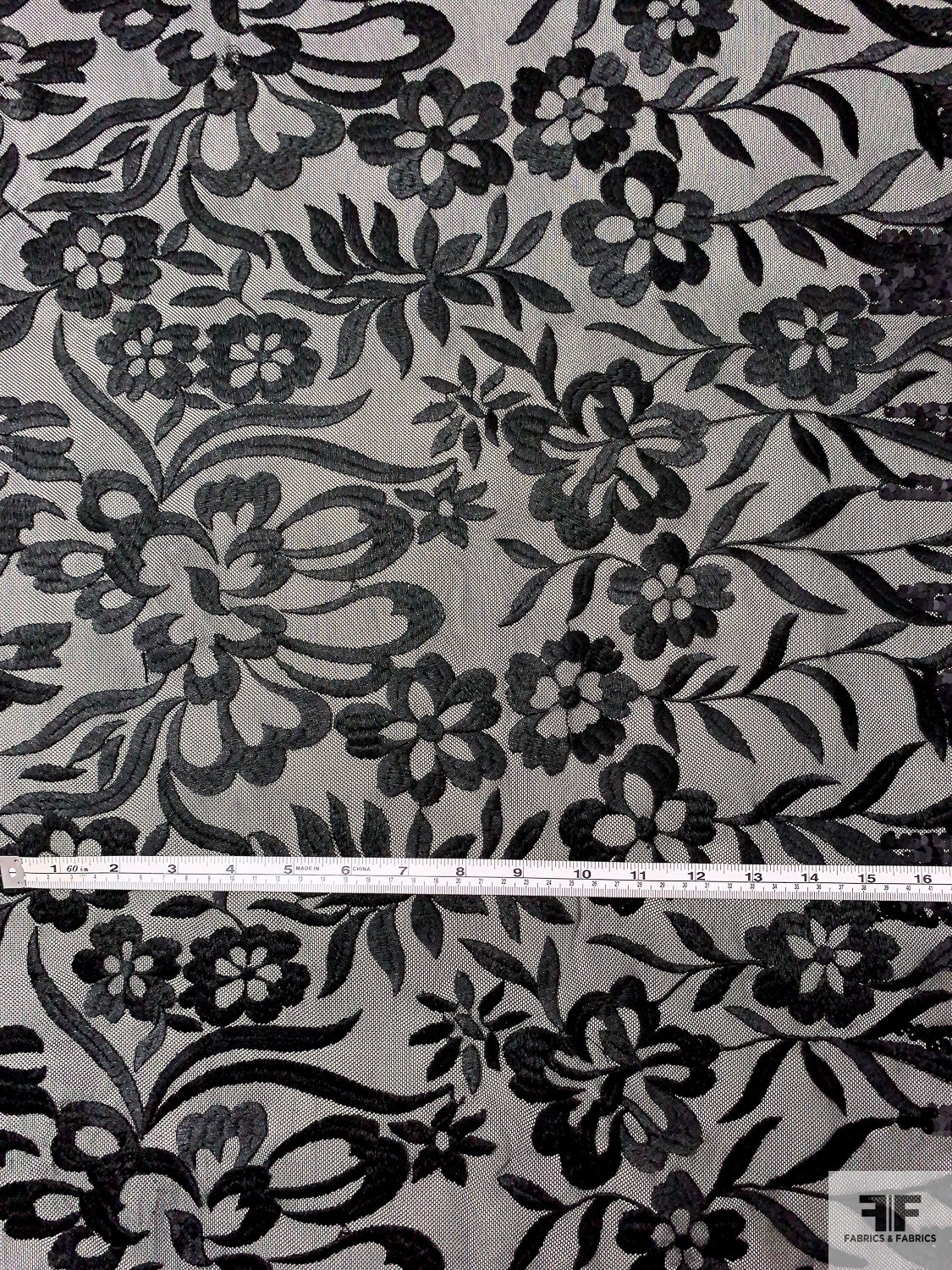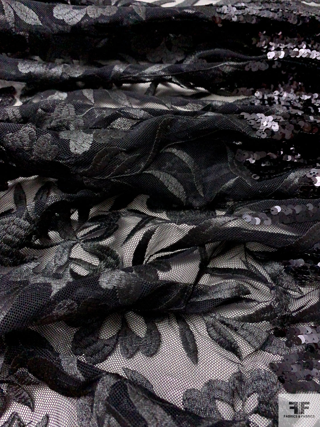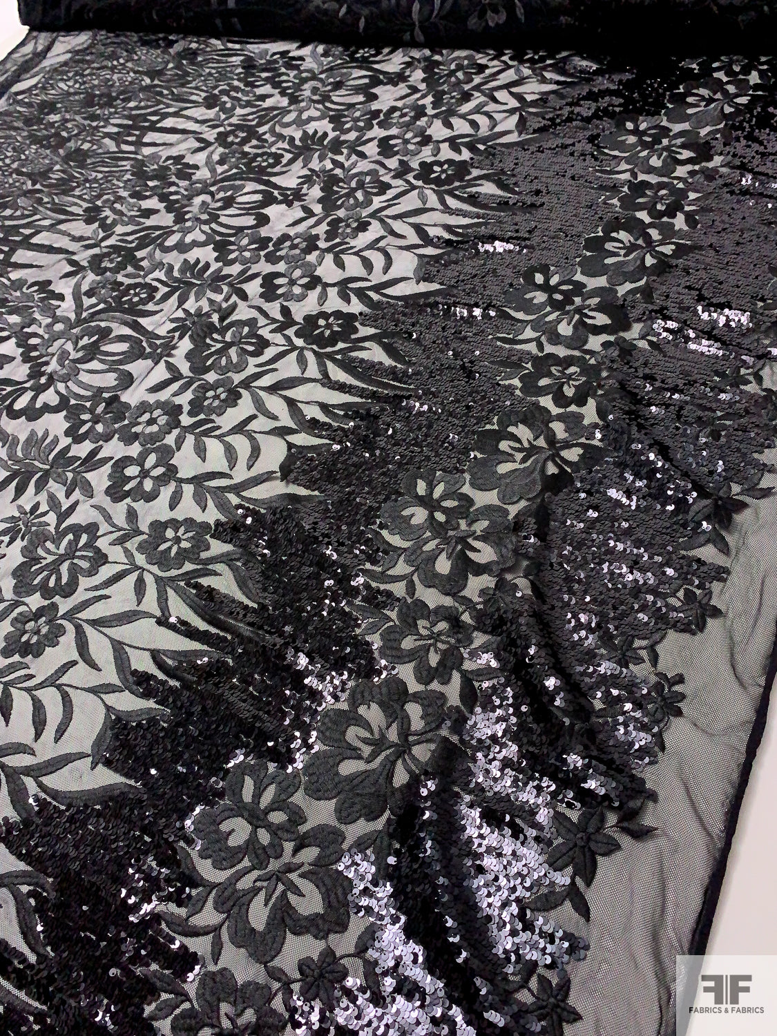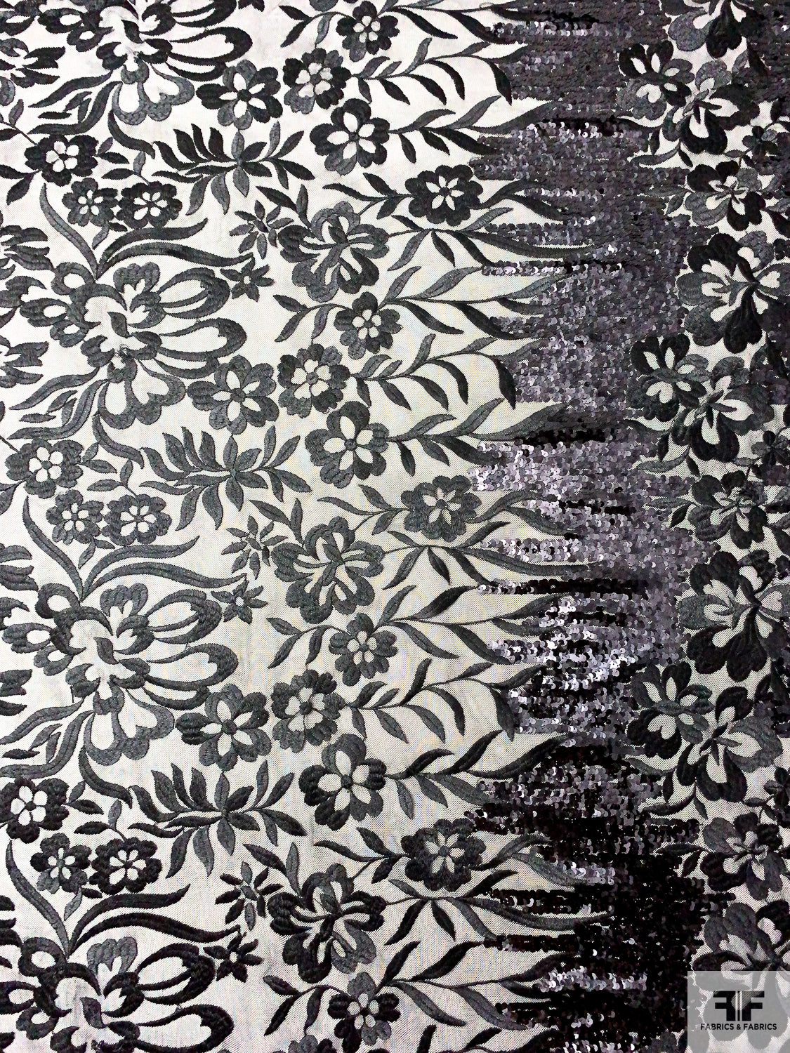 Floral Embroidered Tulle with Sequin Border - Black