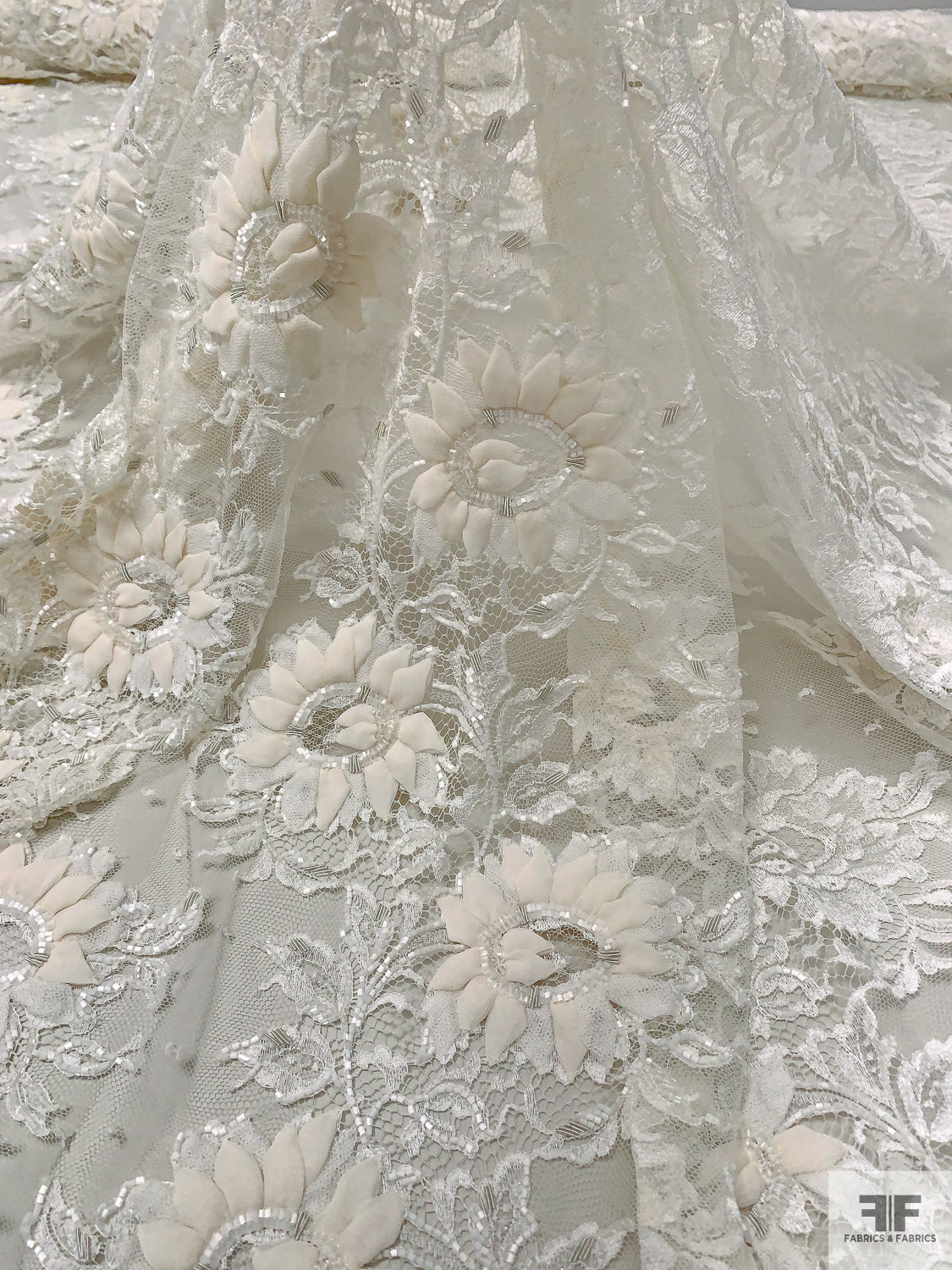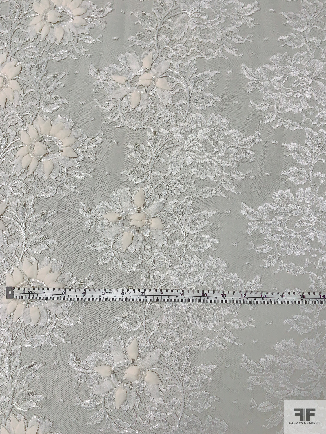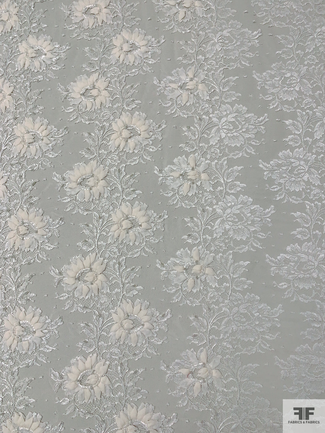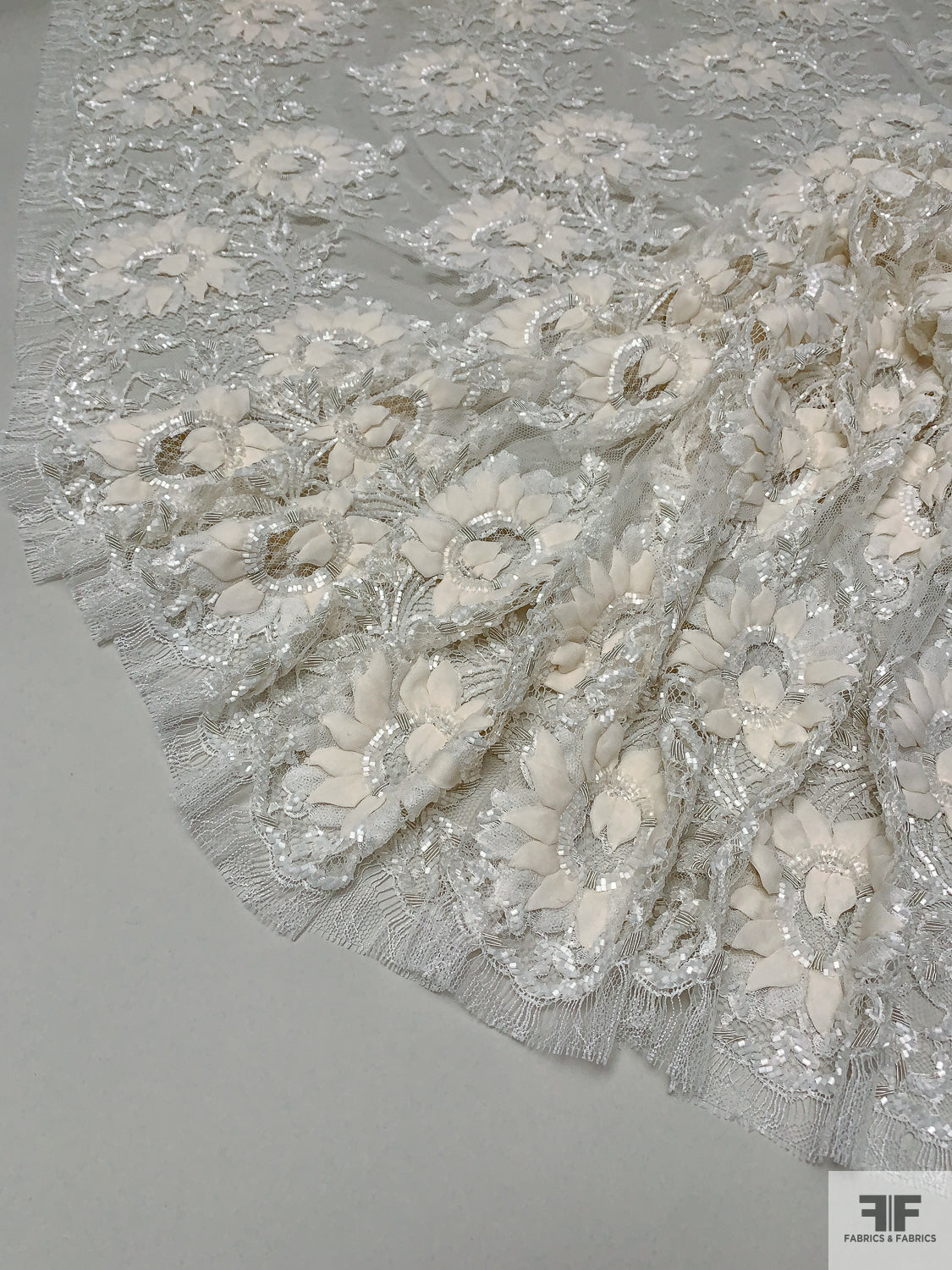 French Embroidered Chantilly Lace with 3D Floral Border - Off-White