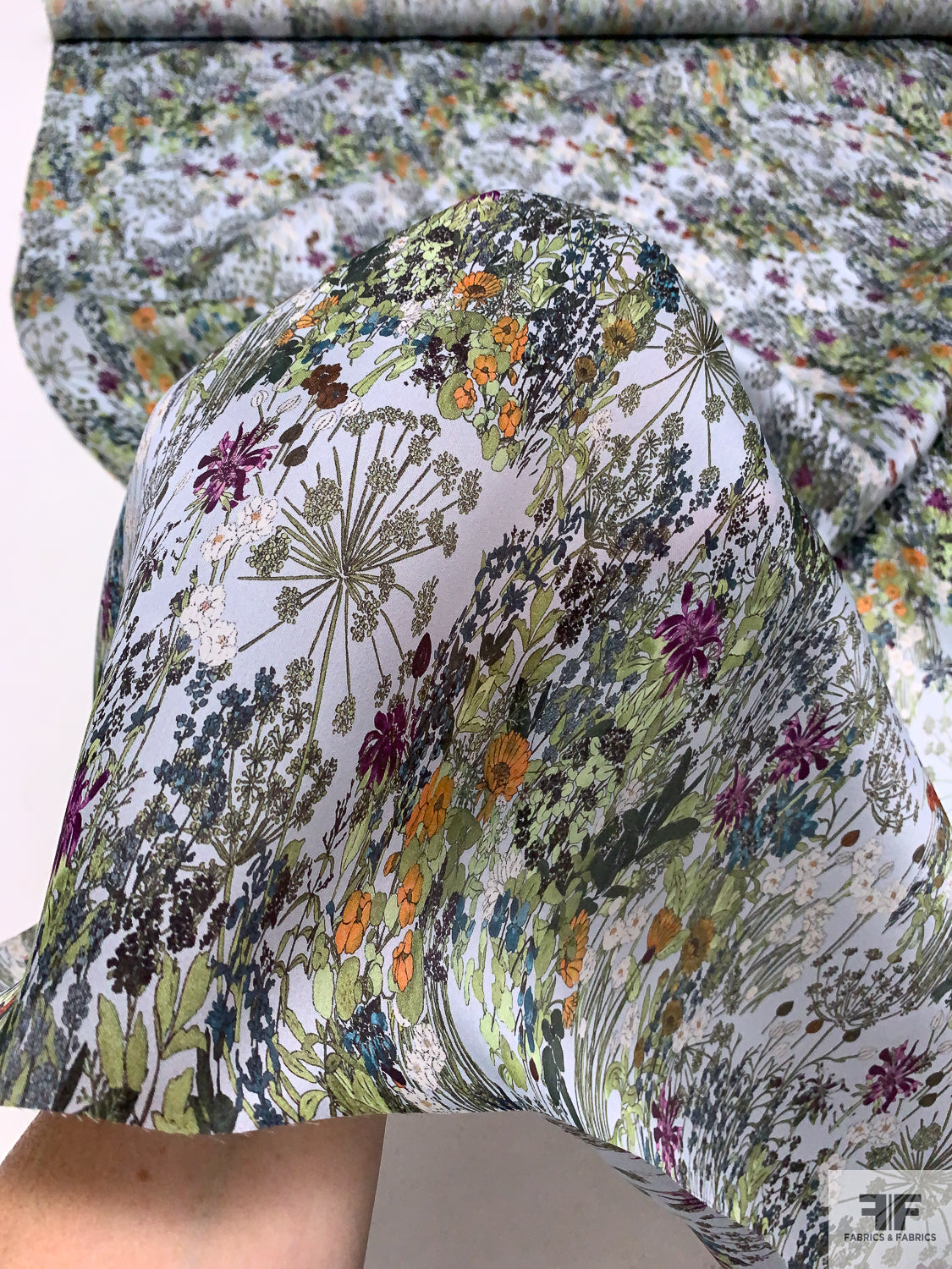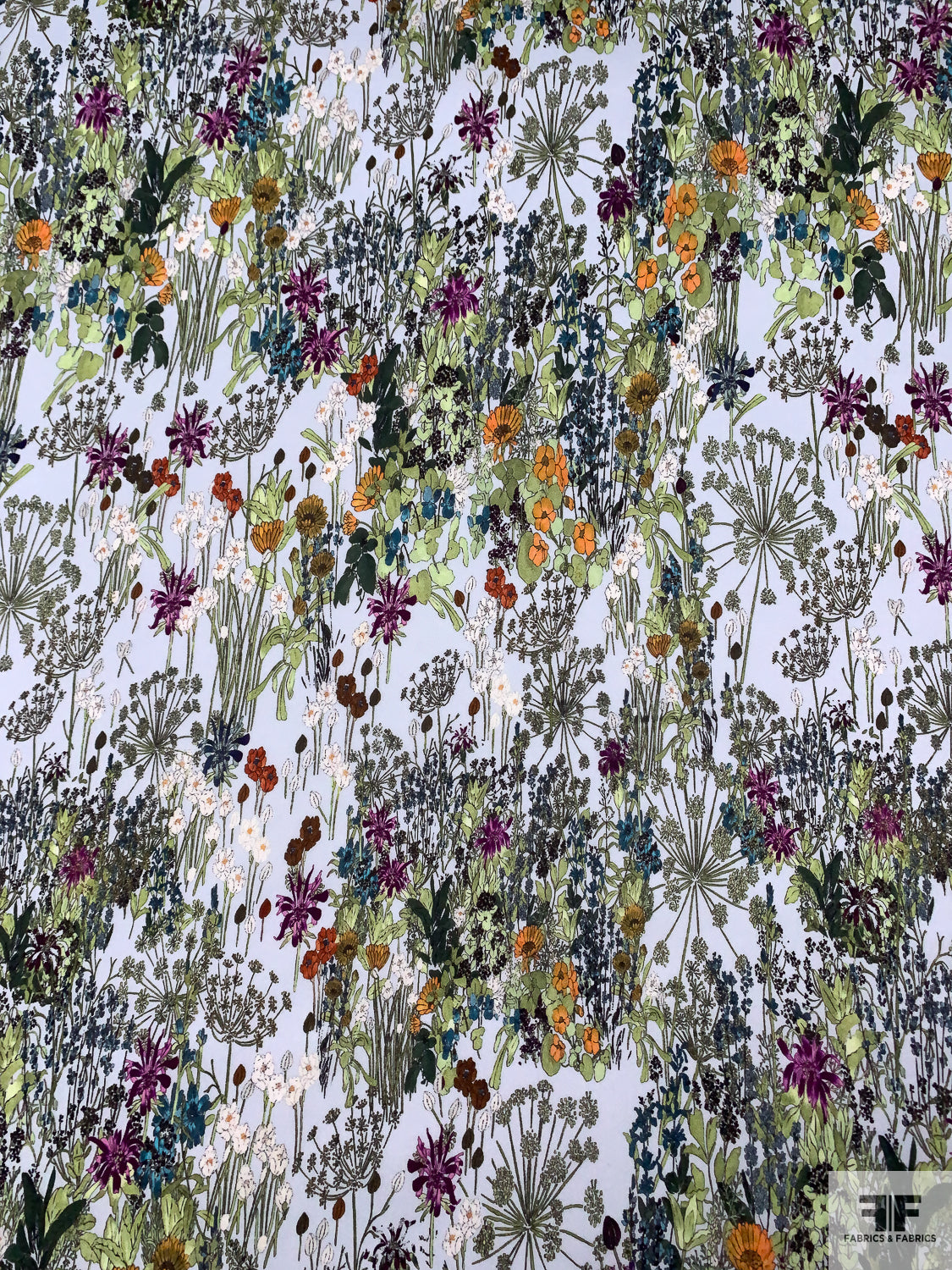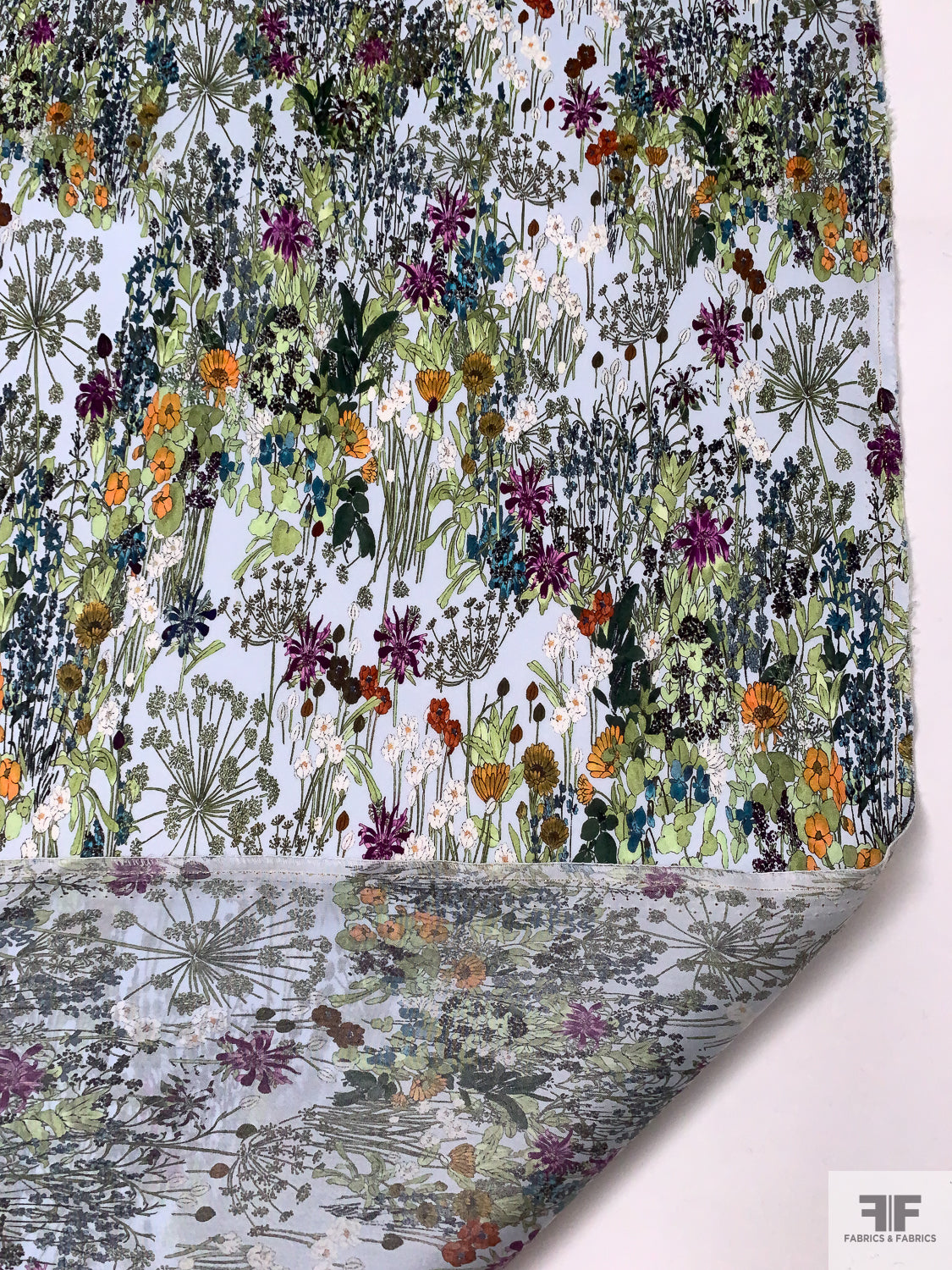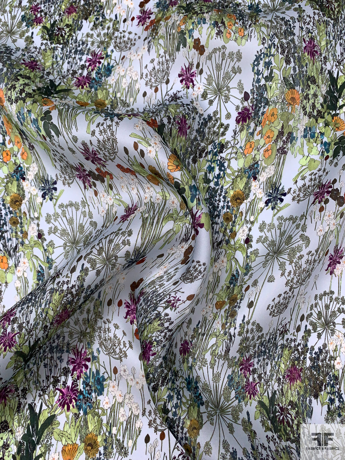 Garden Floral Printed Satin Face Organza - Greens / Orange / Sky Blue / Purple