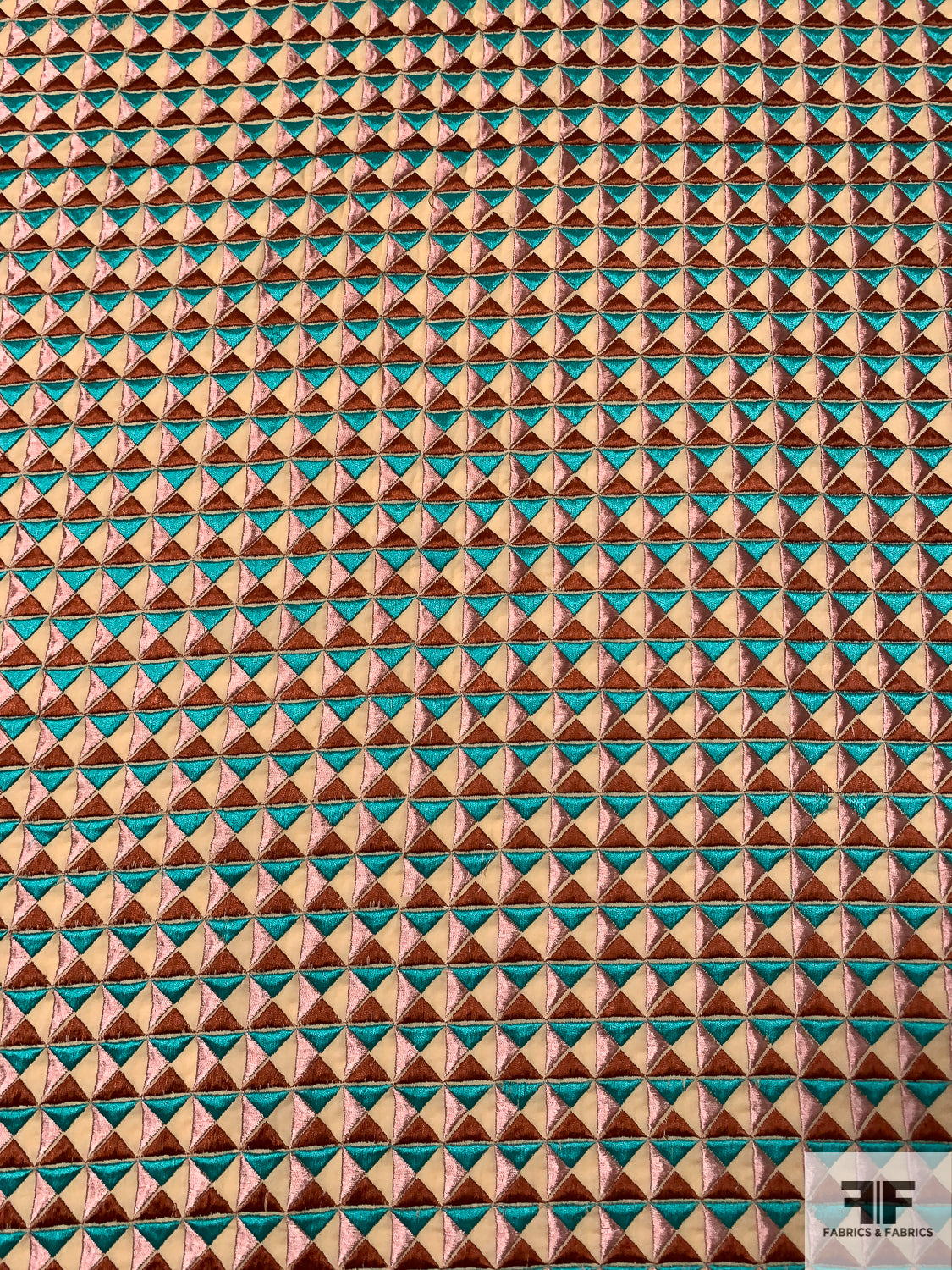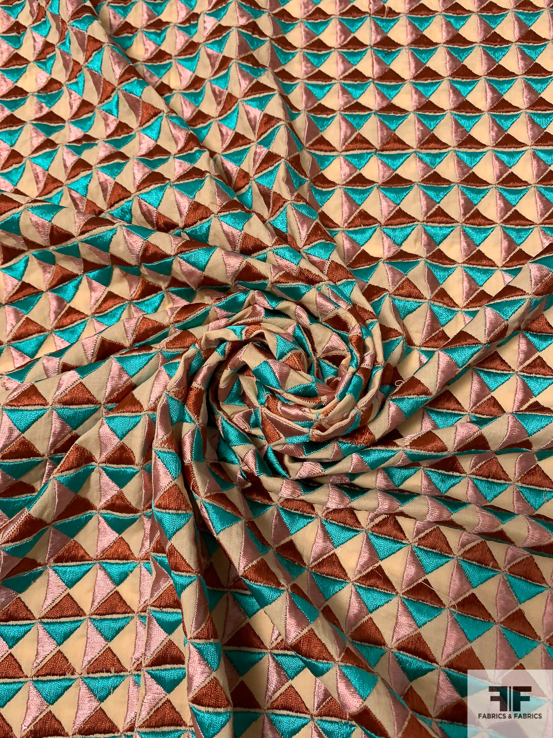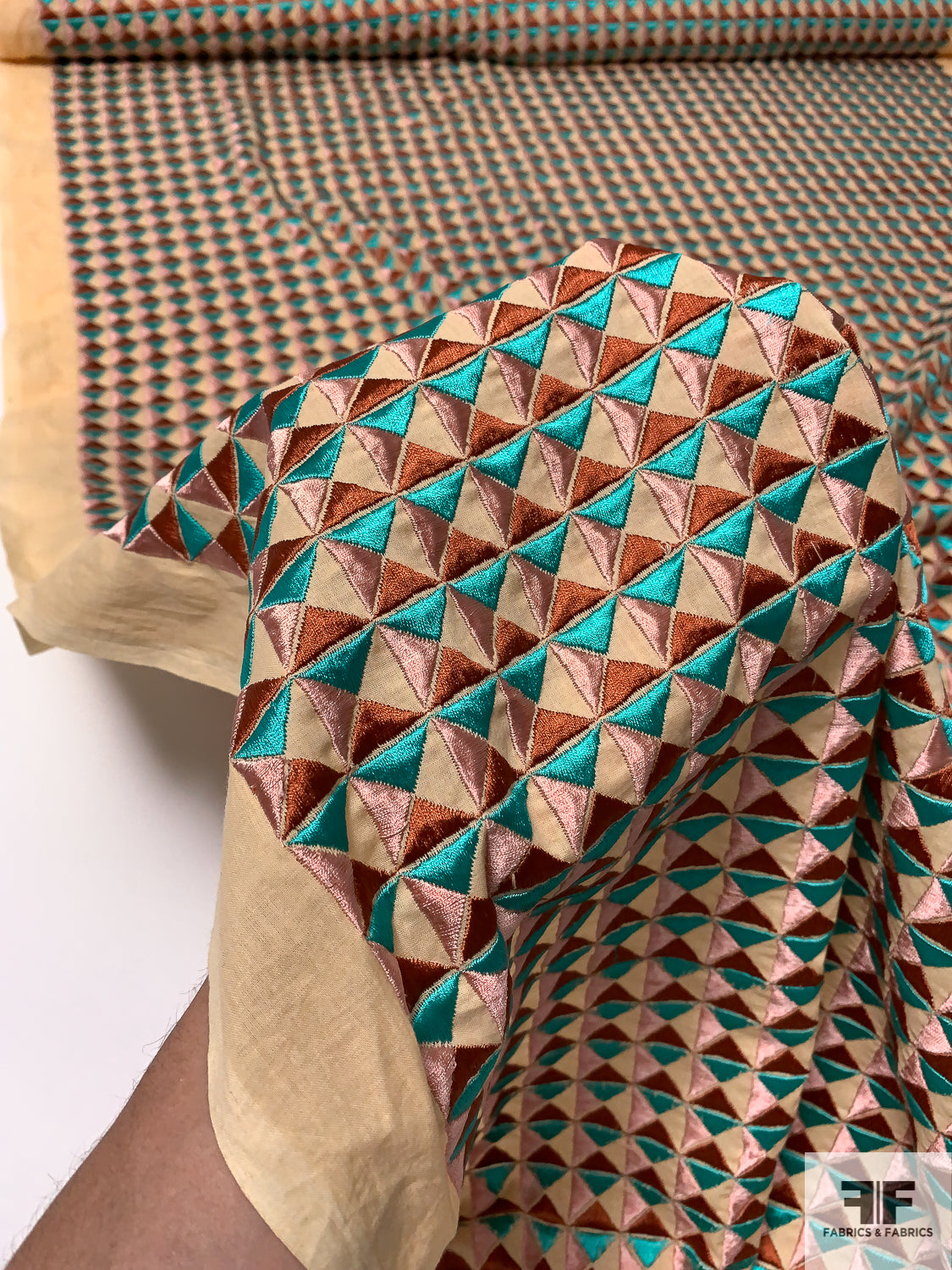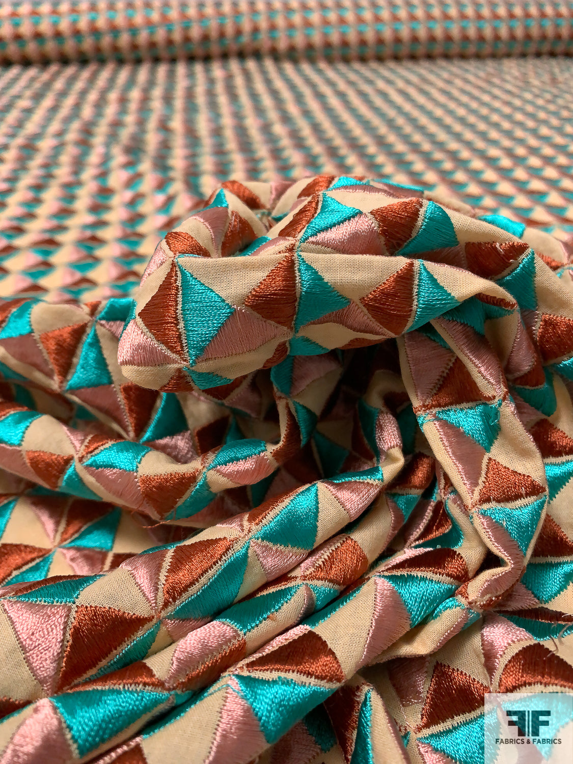 Geometric Tile Embroidered Cotton Lawn - Turquoise Geen / Dusty Pink / Copper / Tan