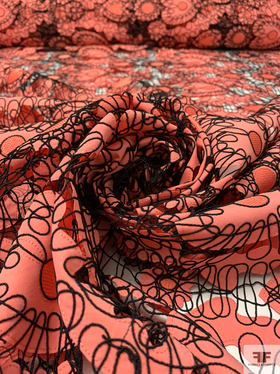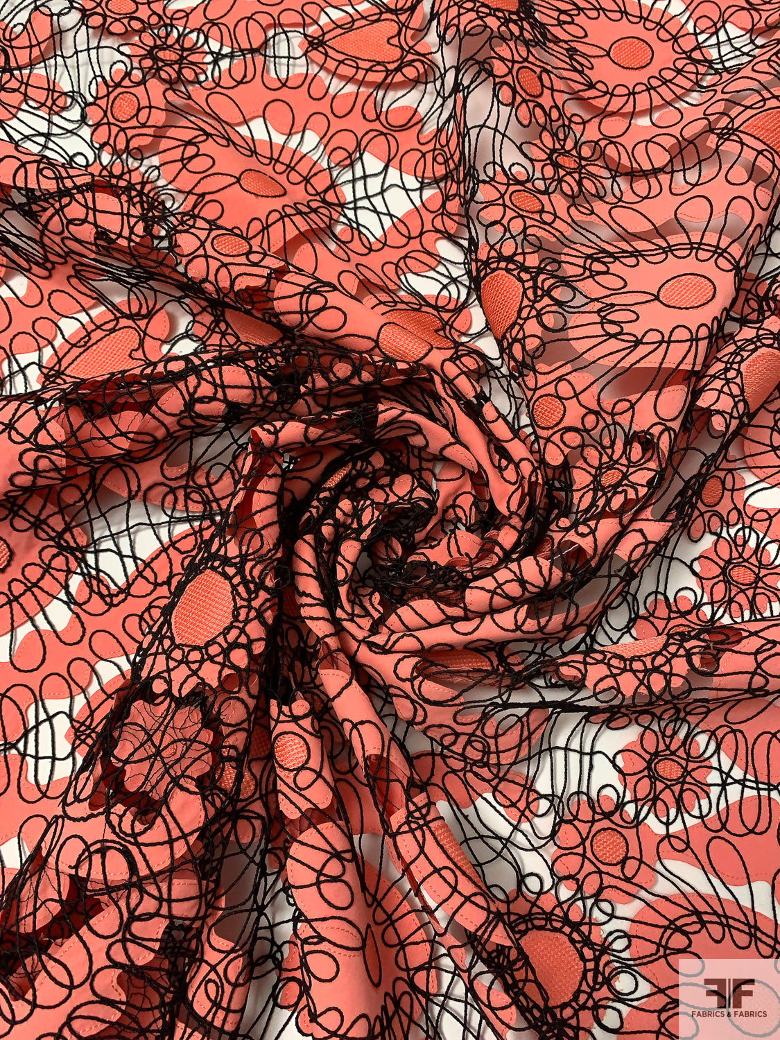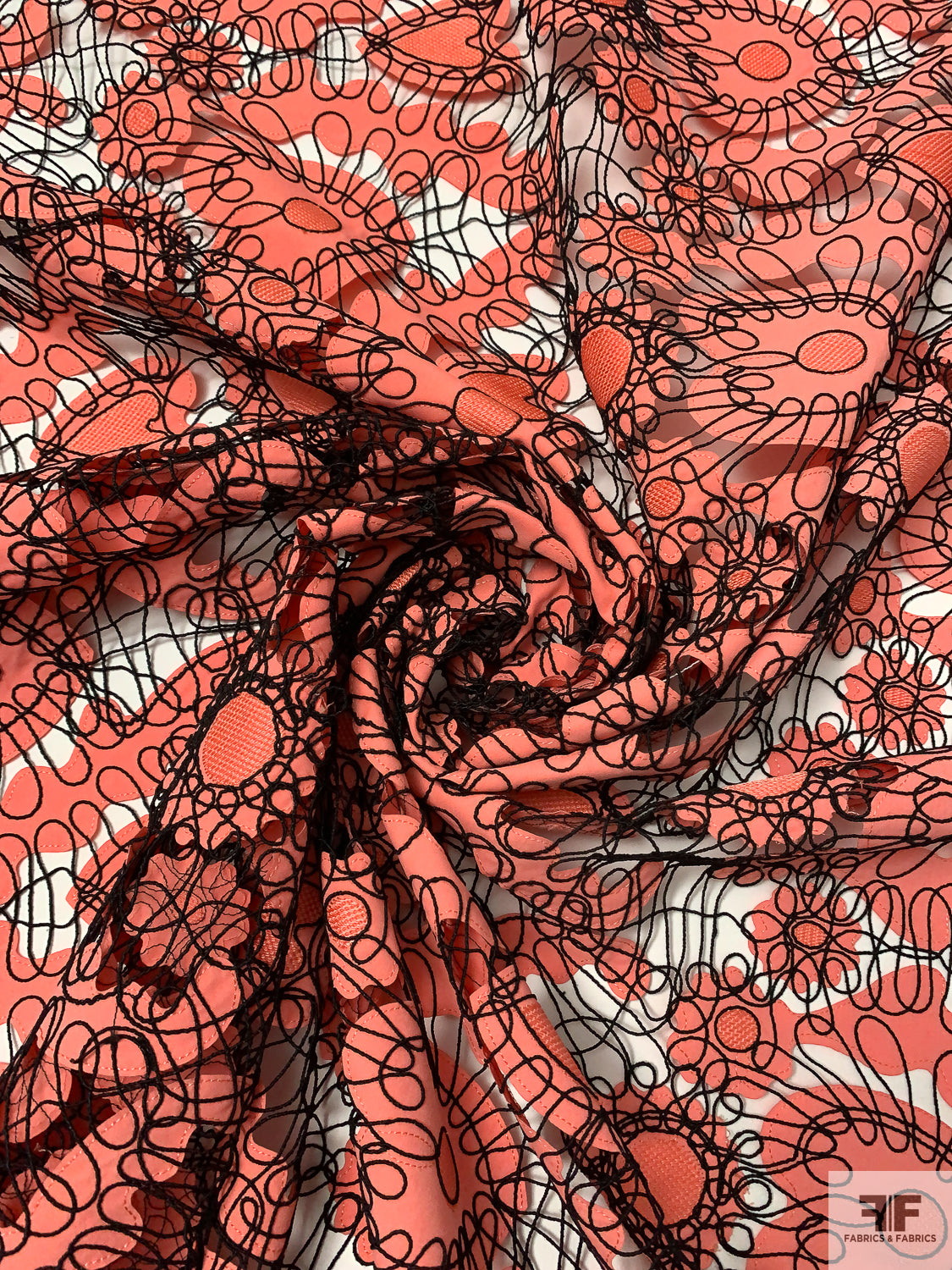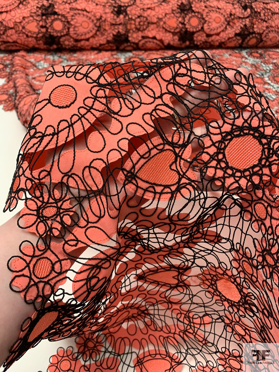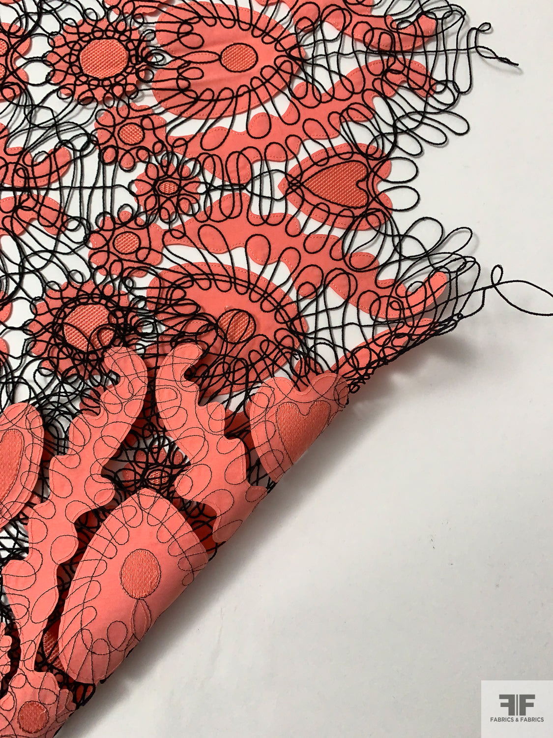 This unique fabric features intricate taffeta-poplin coral cutouts in heart shapes, held together by black corded embroidery. With its open-cutout work and romantic detailing, this textile is ideal for standout garments or special accents. A perfect blend of whimsy and craftsmanship, it offers both visual and textural appeal.