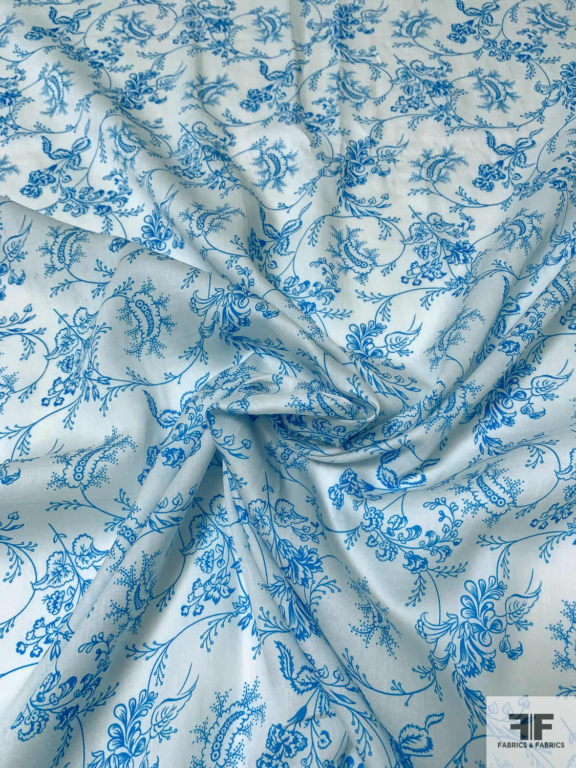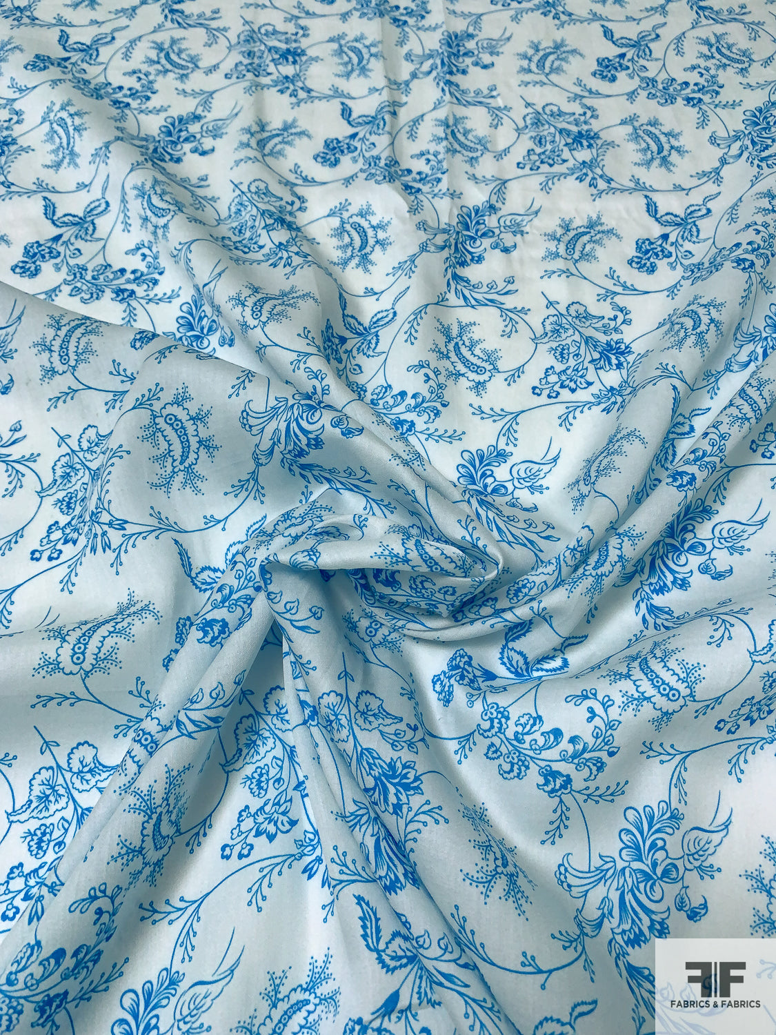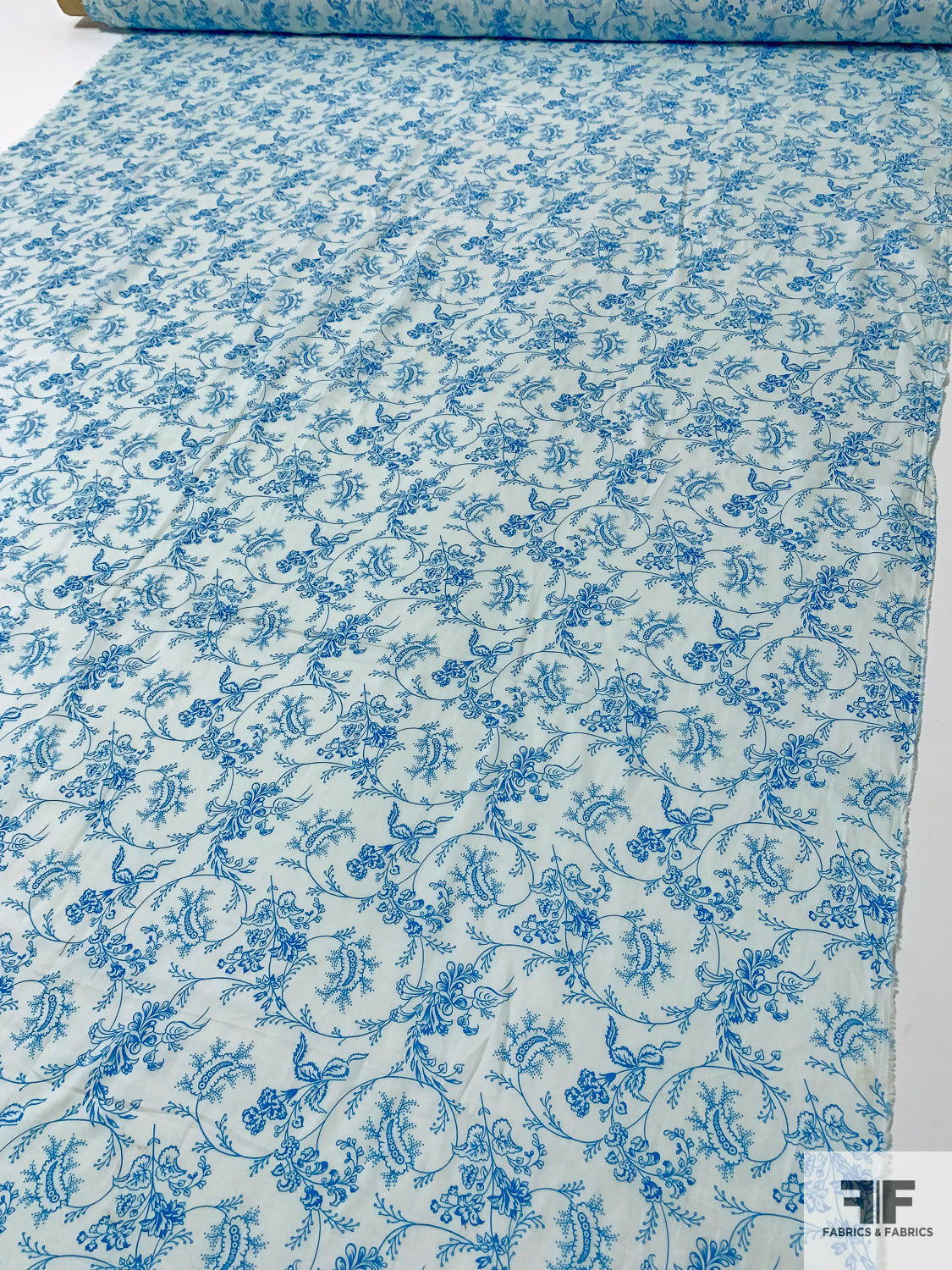 Intricate Floral Vines Printed Fine Sateen Finish Cotton Voile - Turquoise / Ice Blue