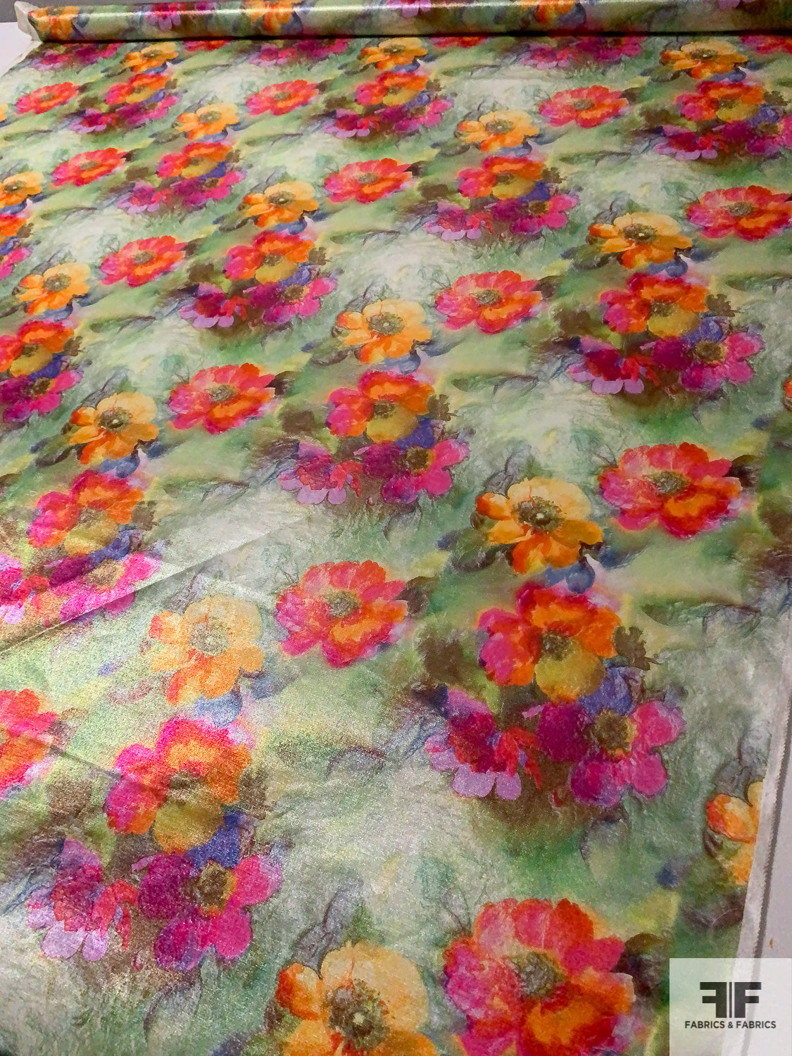 Italian Prabal Gurung Printed Floral Realism Rayon Blend Satin Face Organza with Shimmer Finish - Green / Multicolor