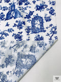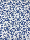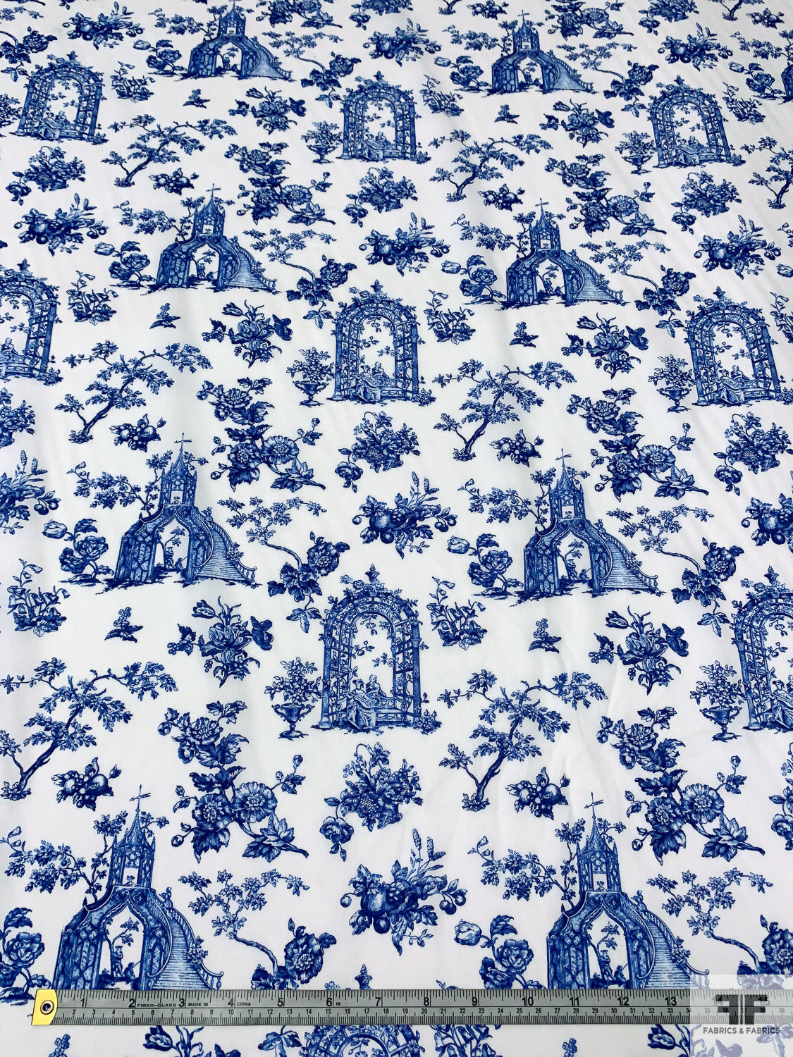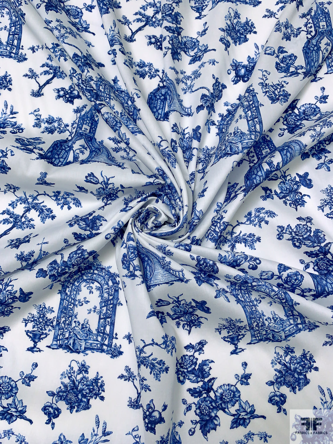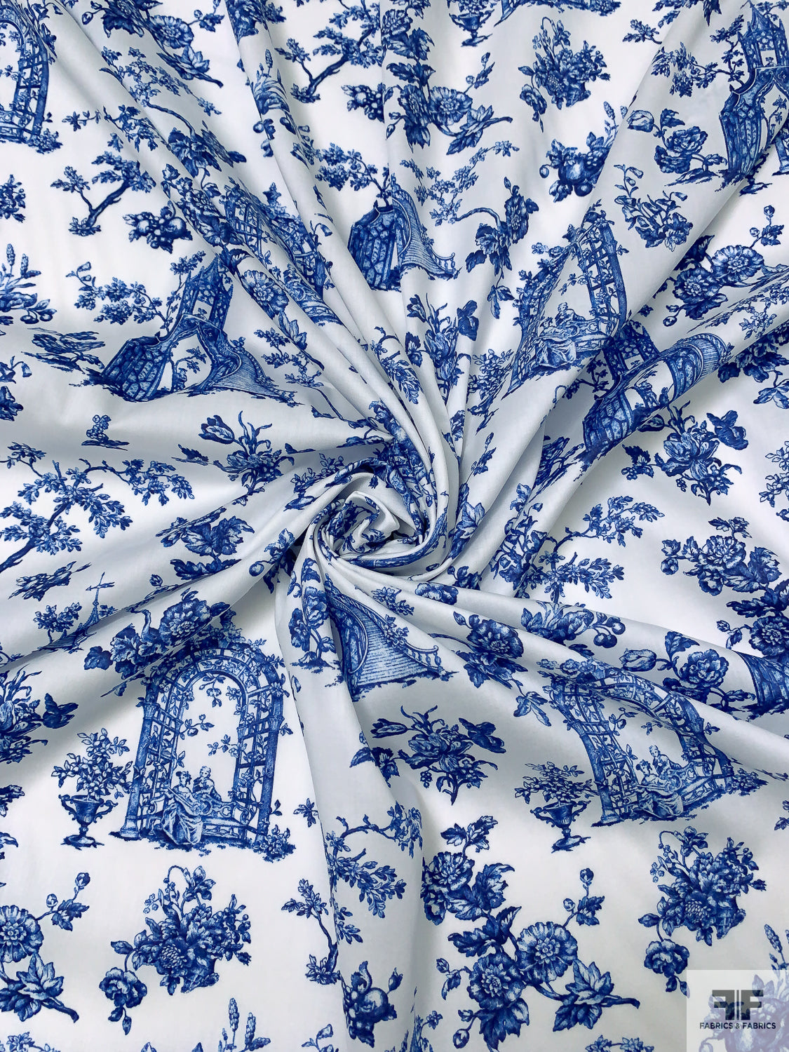 Italian Toile de Jouy Garden Arches Printed Cotton Sateen-Lawn - Blue / Off-White