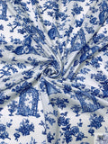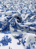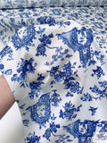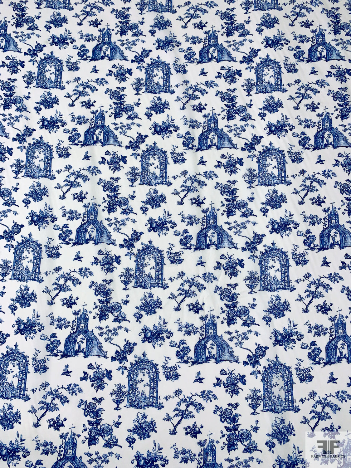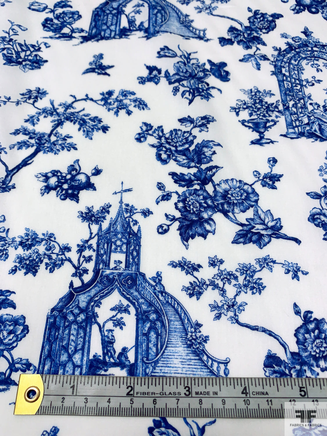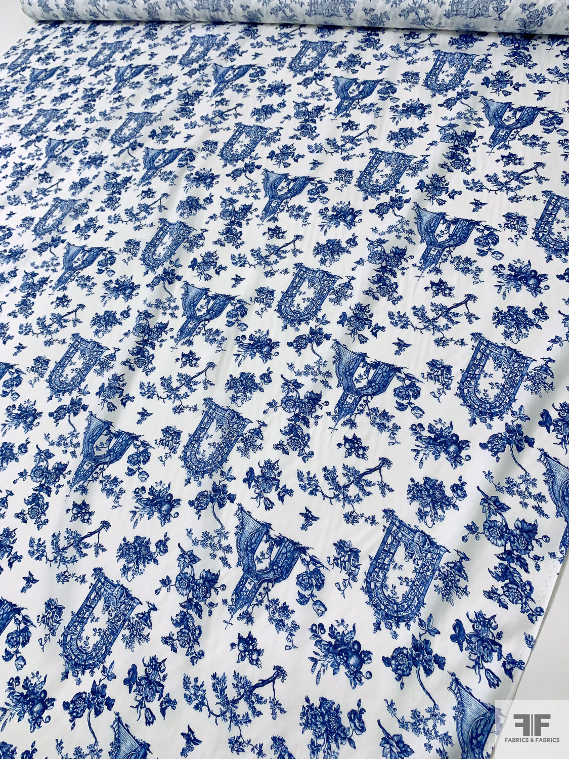 Italian Toile de Jouy Garden Arches Printed Cotton Sateen-Lawn - Blue / Off-White