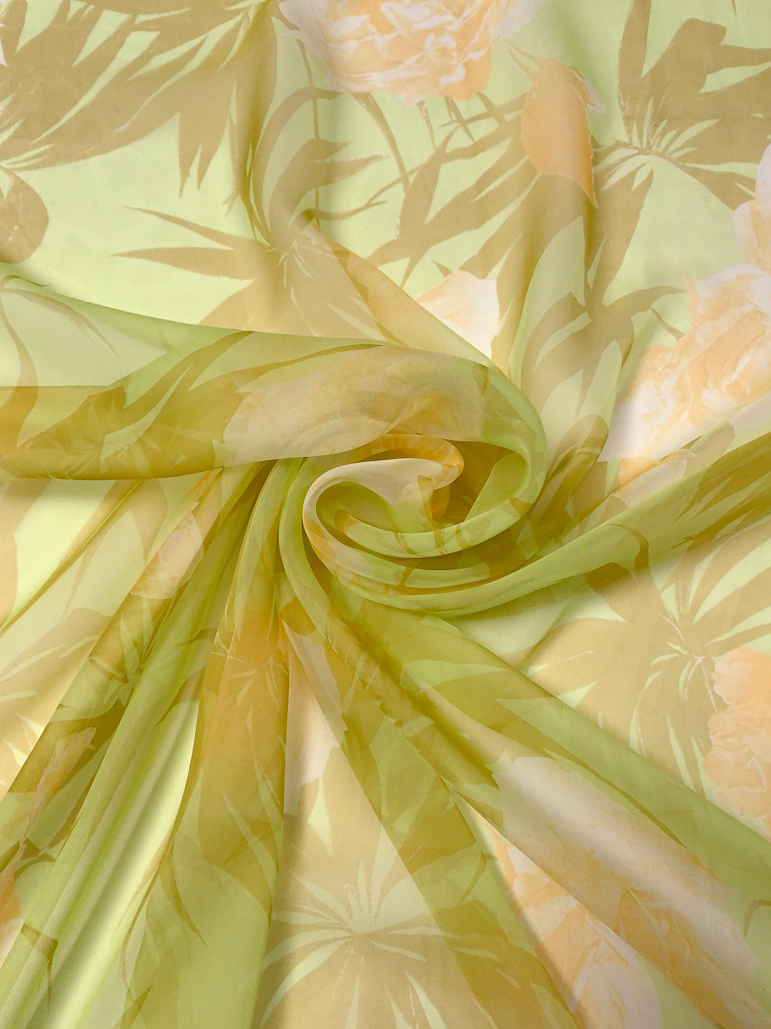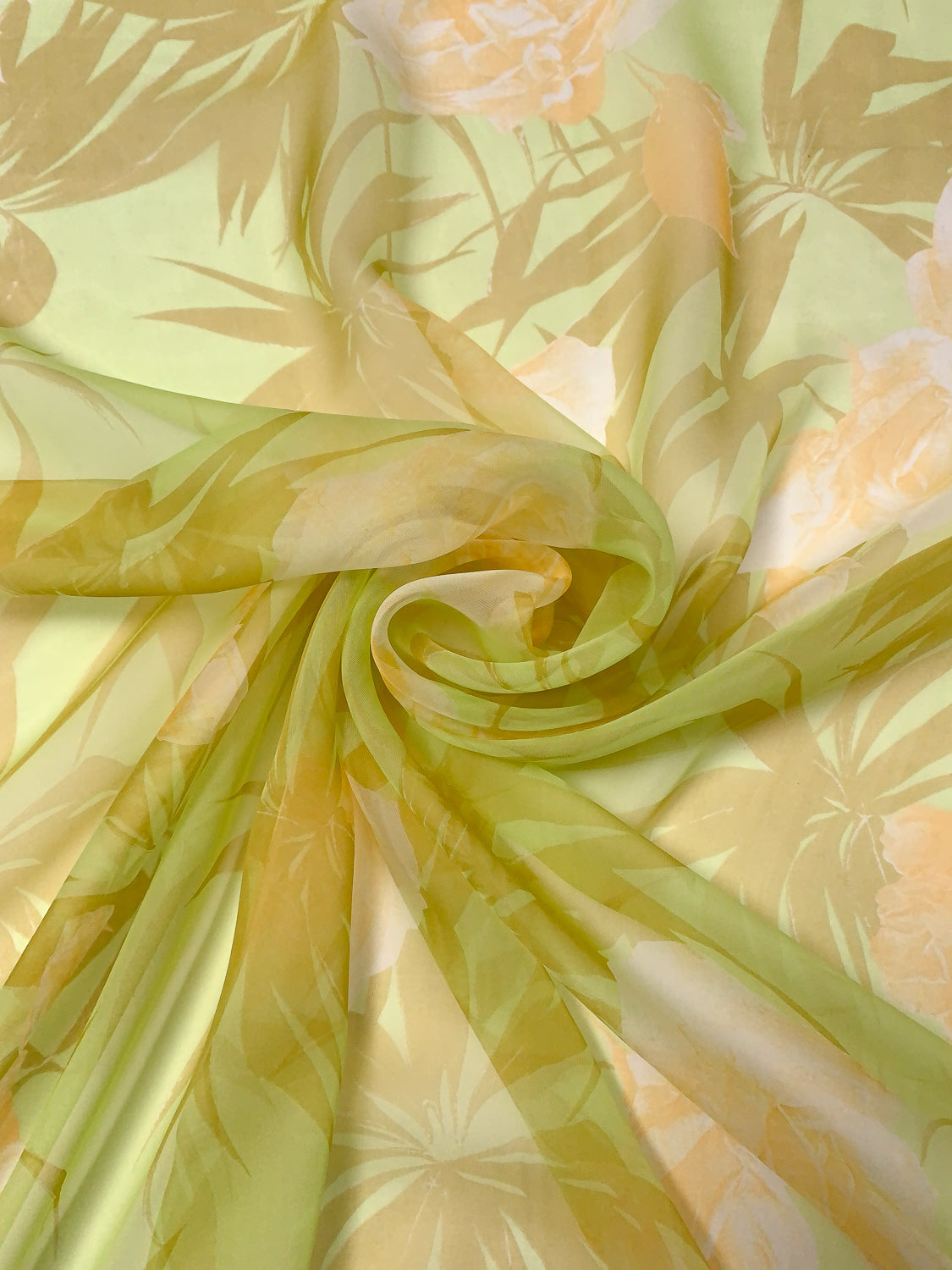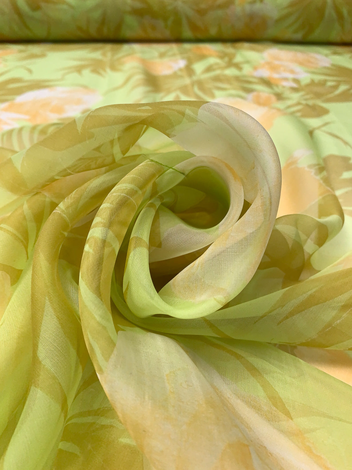 Italian Vintage Vera Wang Floral Printed Fine Silk Chiffon - Tea Green / Olive / Warm Yellow / Off-White