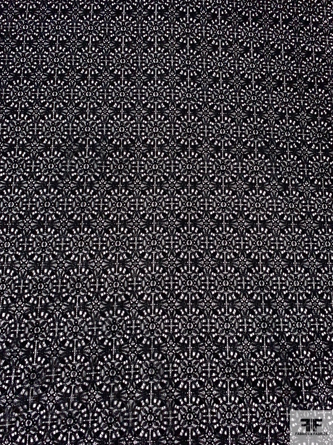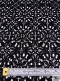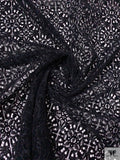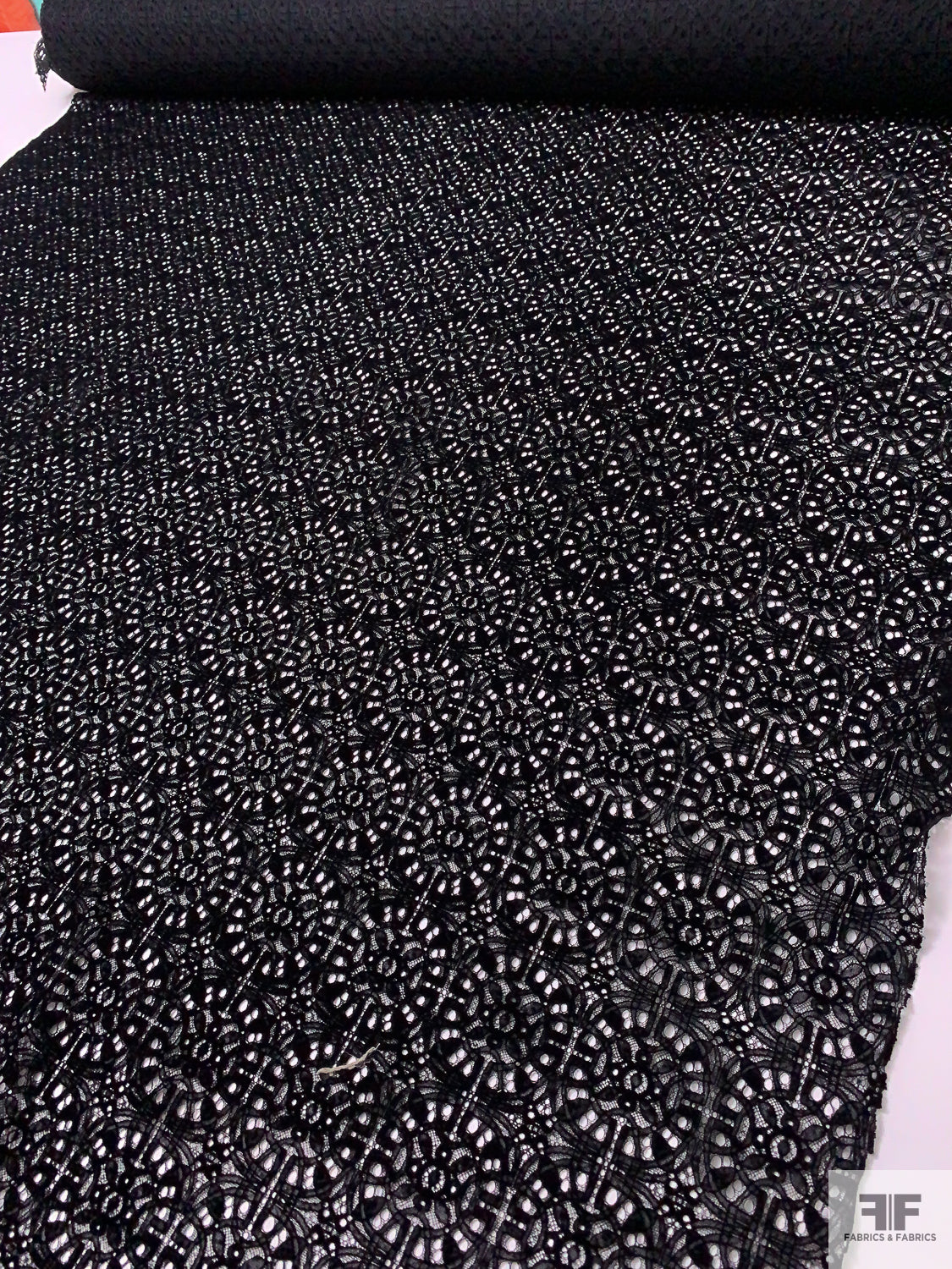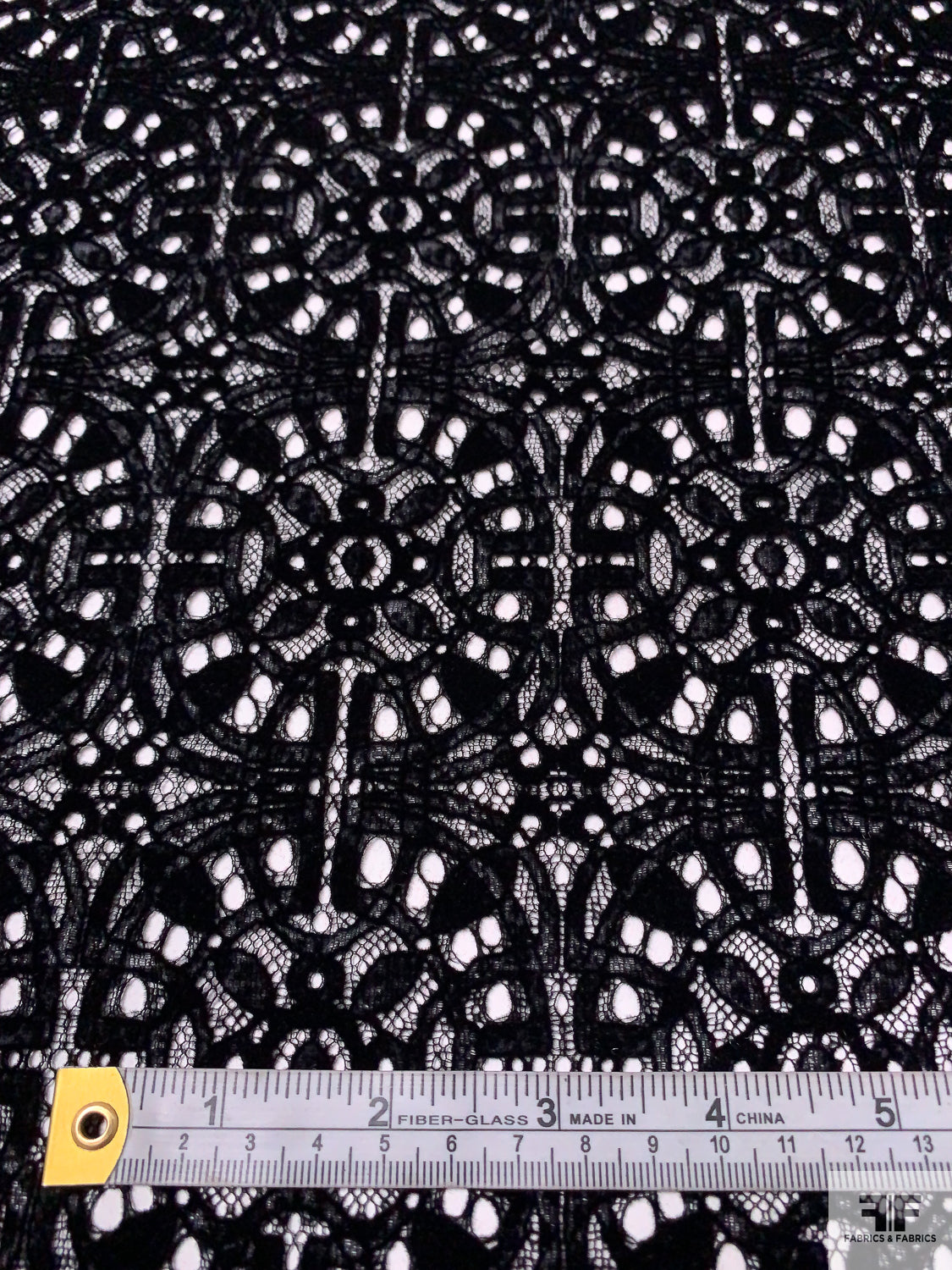 This striking black lace features a medallion motif enhanced by a rich, flocked texture that adds dimension and tactile appeal. The flocking creates a velvety surface that contrasts beautifully against the sheer lace base, offering both visual depth and softness. With its ornate pattern and bold presence, this fabric lends itself perfectly to dramatic eveningwear, statement pieces, and avant-garde design. A distinctive choice for those seeking texture and elegance in black lace.