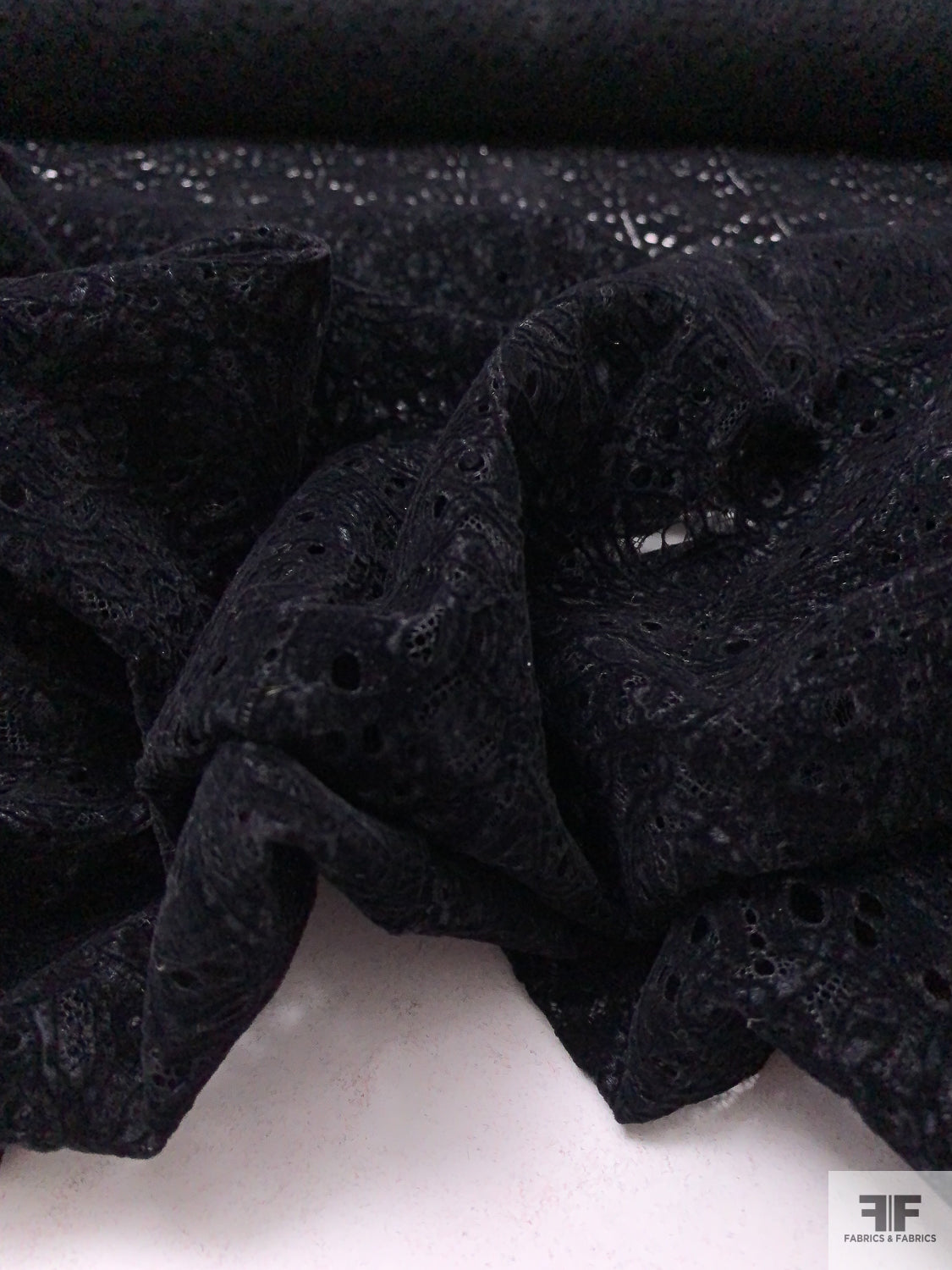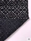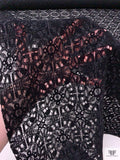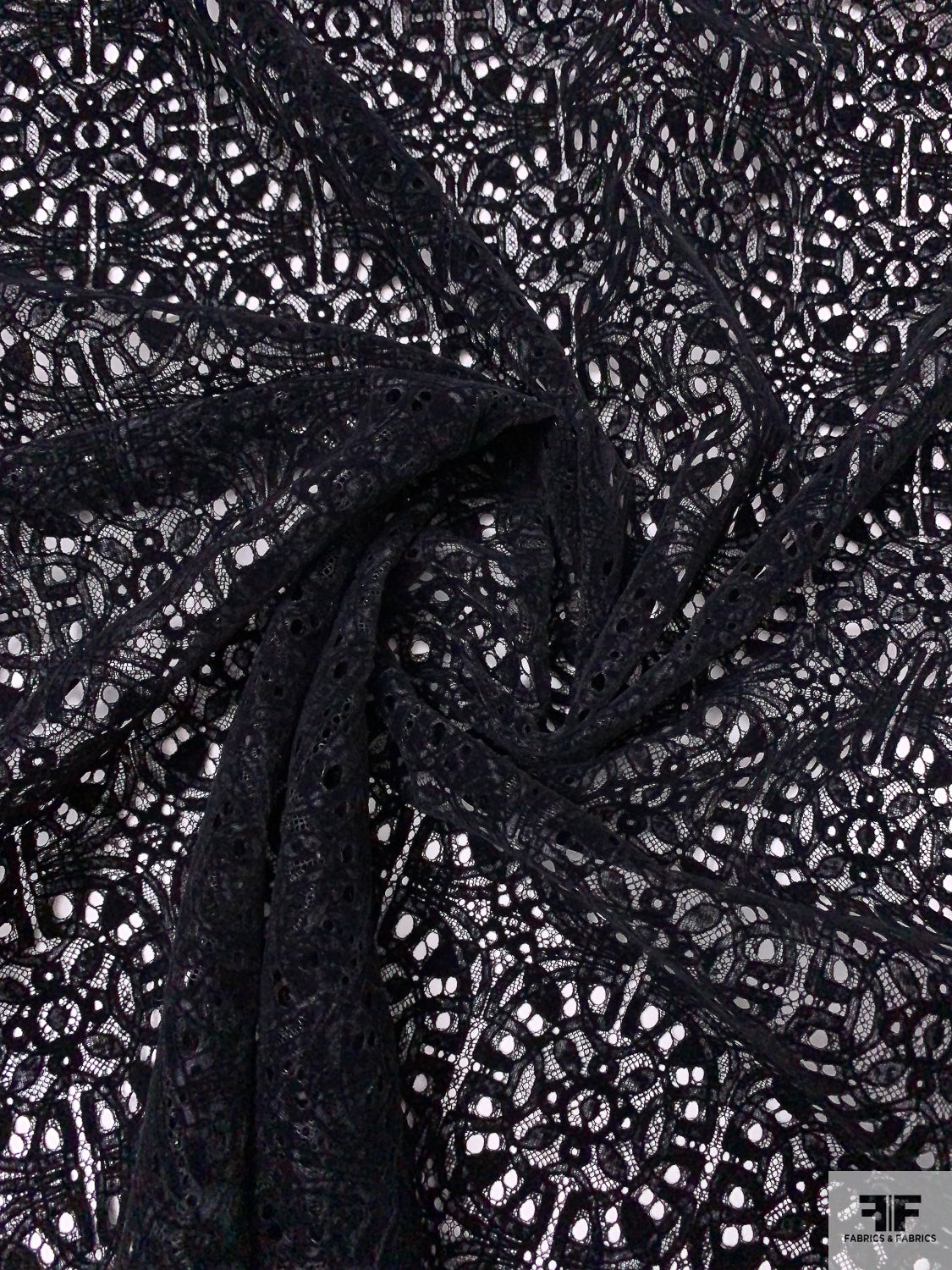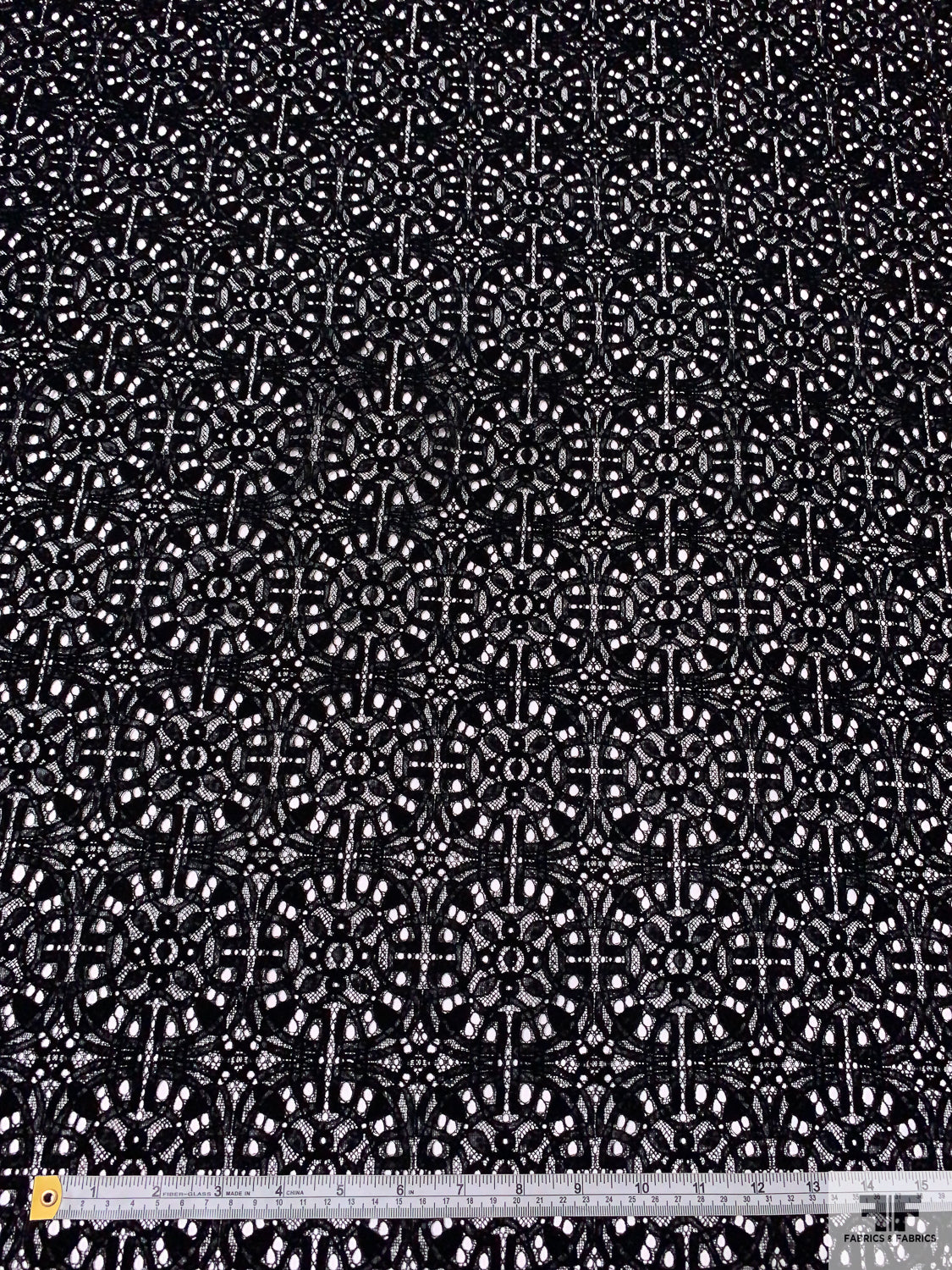 This striking black lace features a medallion motif enhanced by a rich, flocked texture that adds dimension and tactile appeal. The flocking creates a velvety surface that contrasts beautifully against the sheer lace base, offering both visual depth and softness. With its ornate pattern and bold presence, this fabric lends itself perfectly to dramatic eveningwear, statement pieces, and avant-garde design. A distinctive choice for those seeking texture and elegance in black lace.
