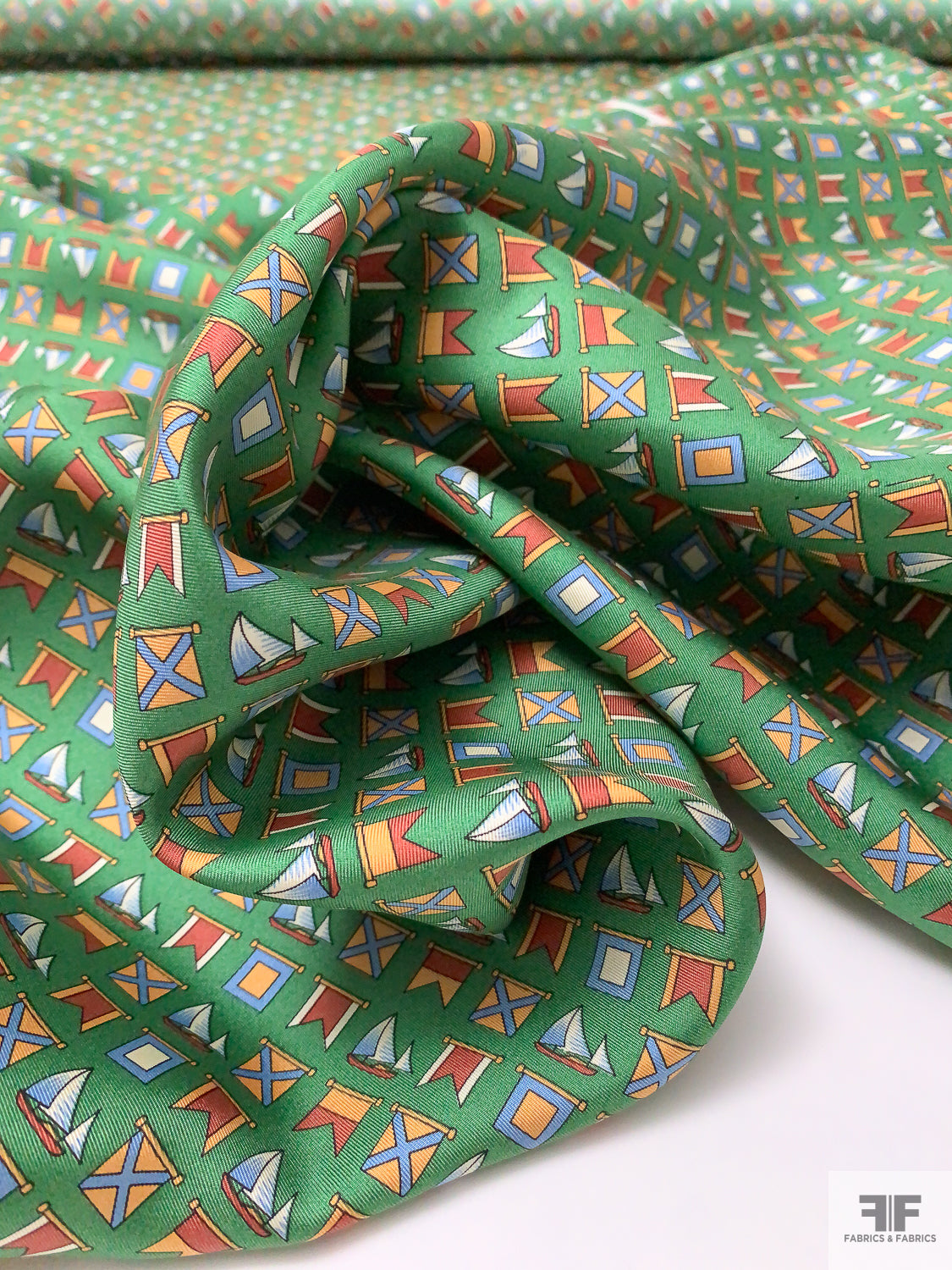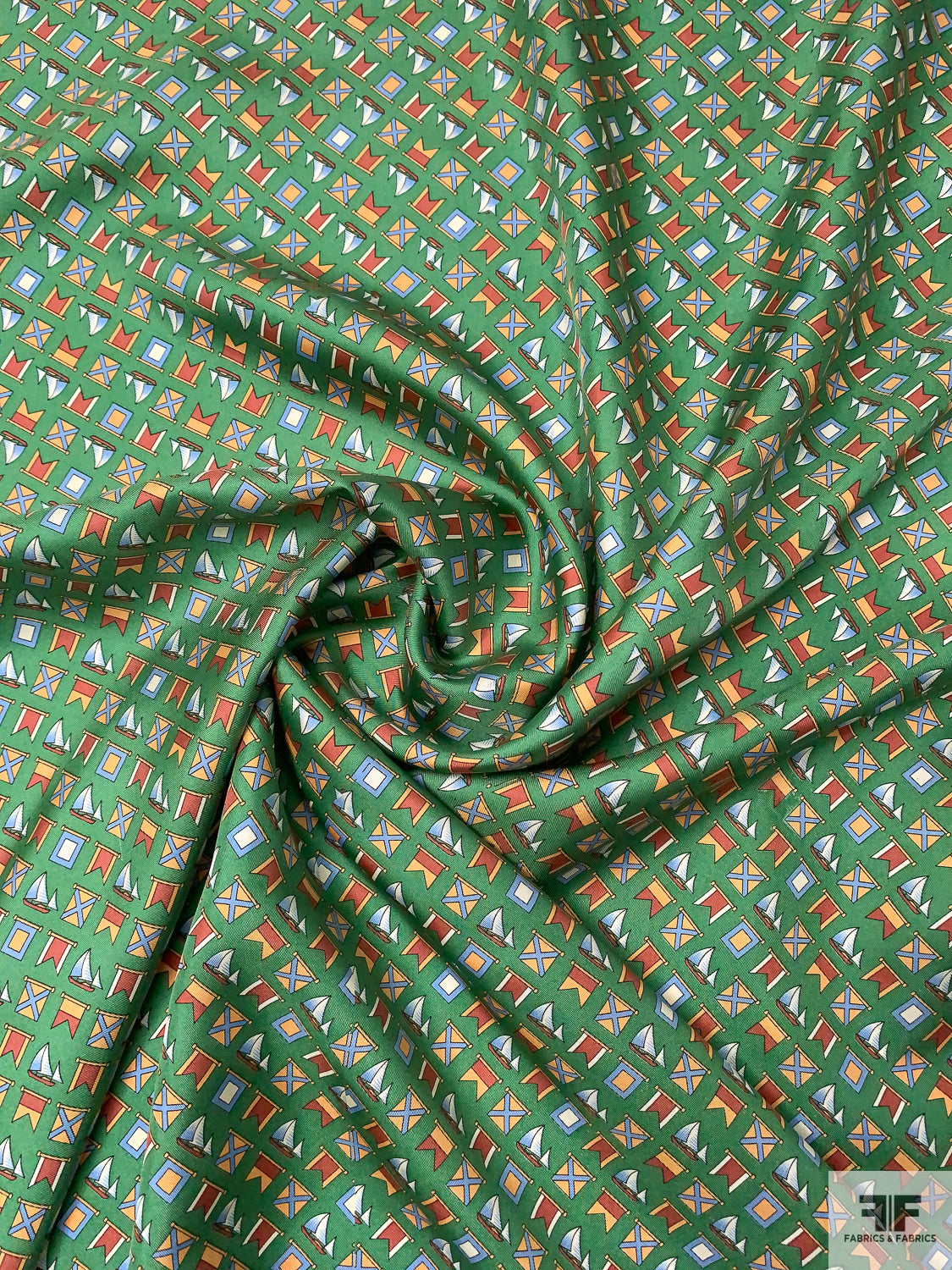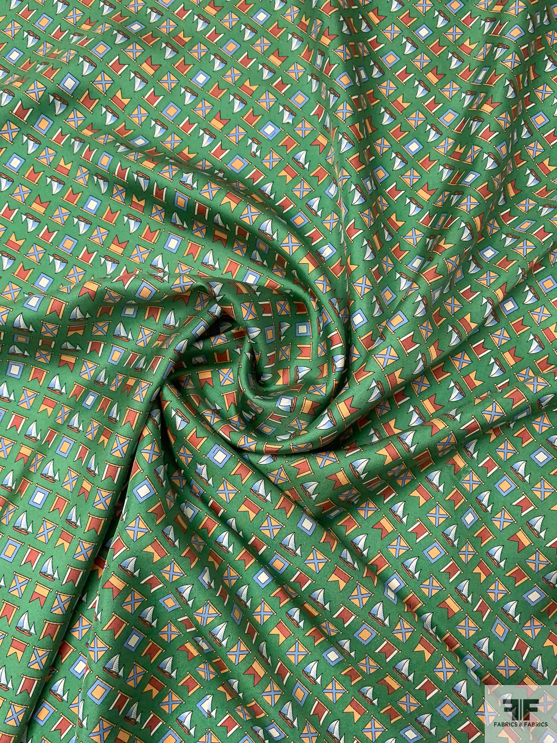 Nautical Flags Printed Fine Silk Twill Panel - Fern Green / Nude Orange / Burnt Coral