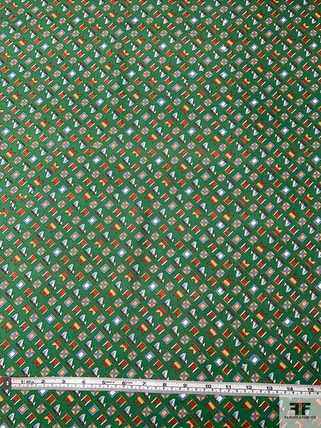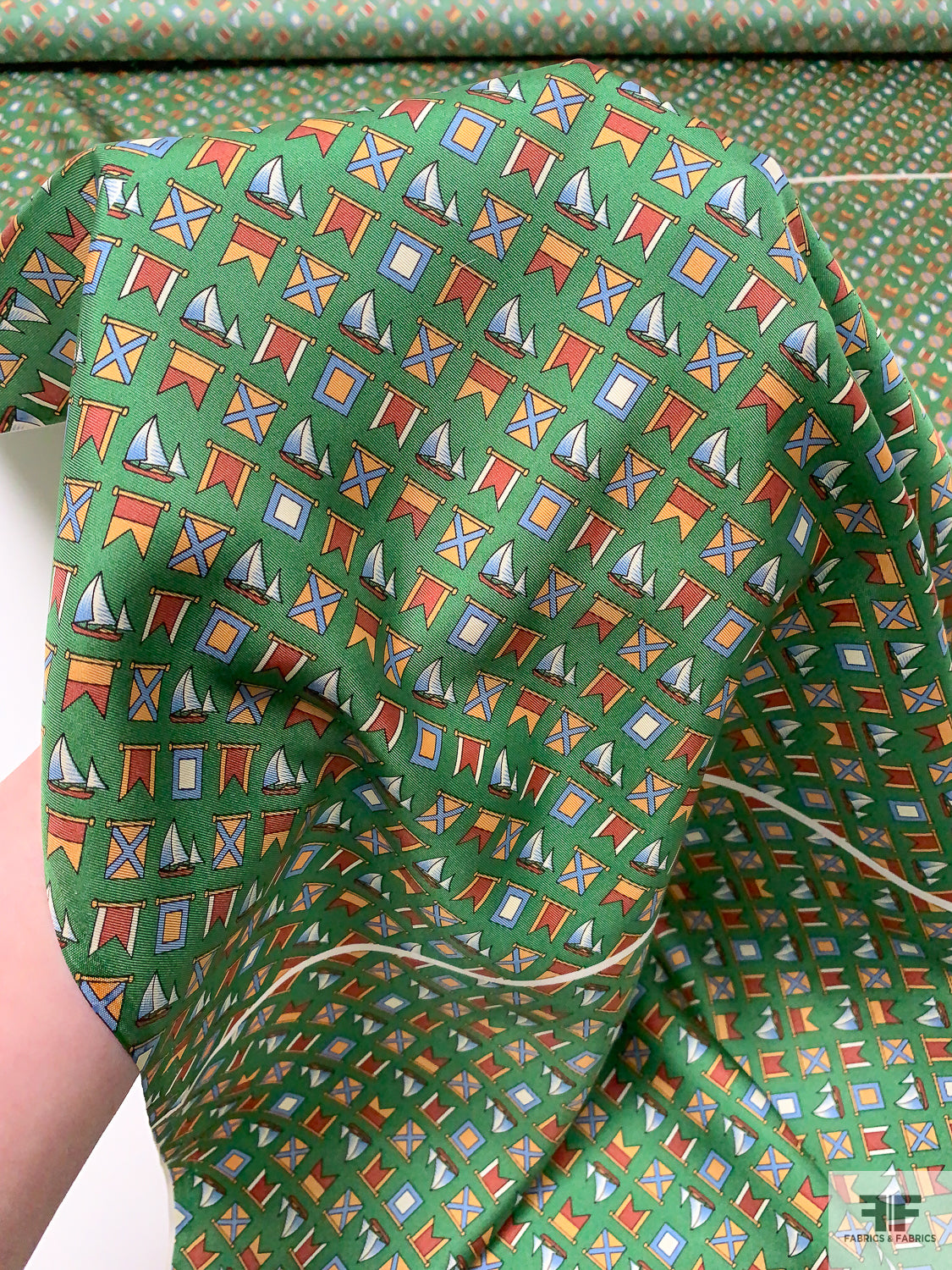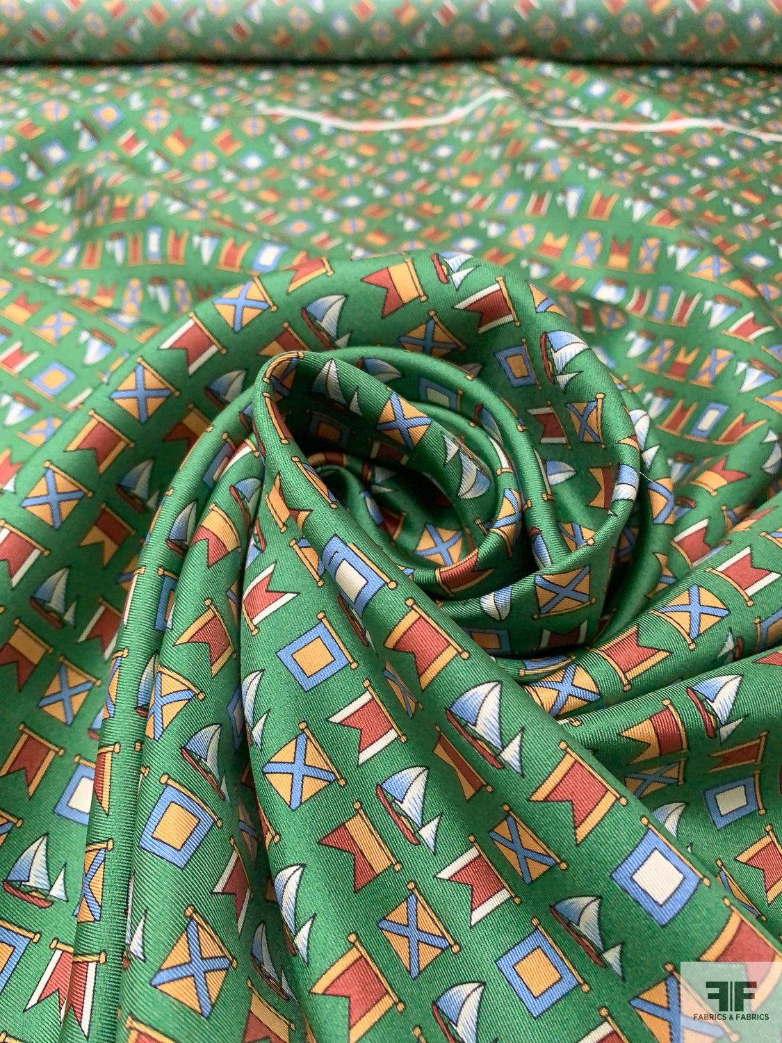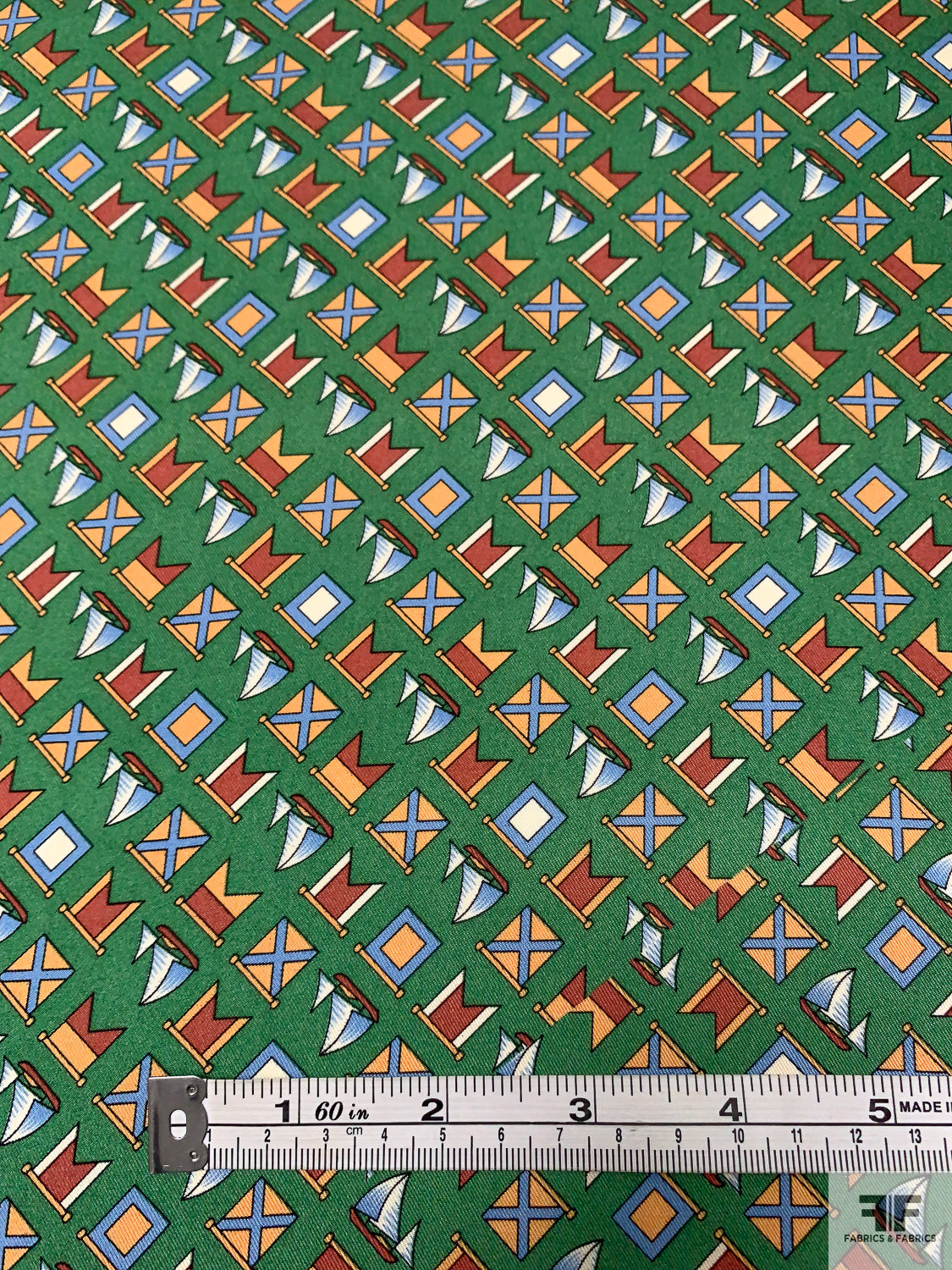 Nautical Flags Printed Fine Silk Twill Panel - Fern Green / Nude Orange / Burnt Coral
