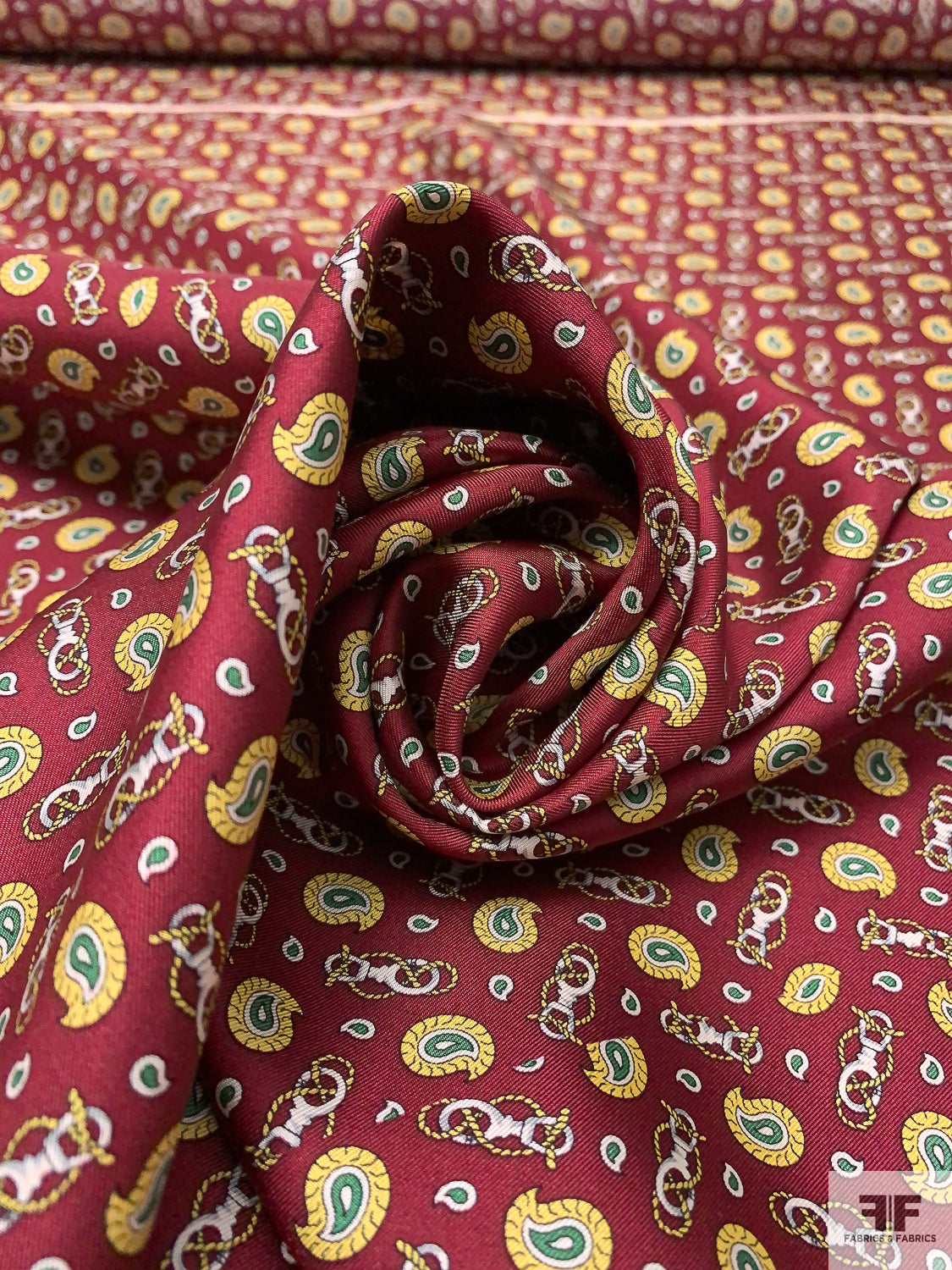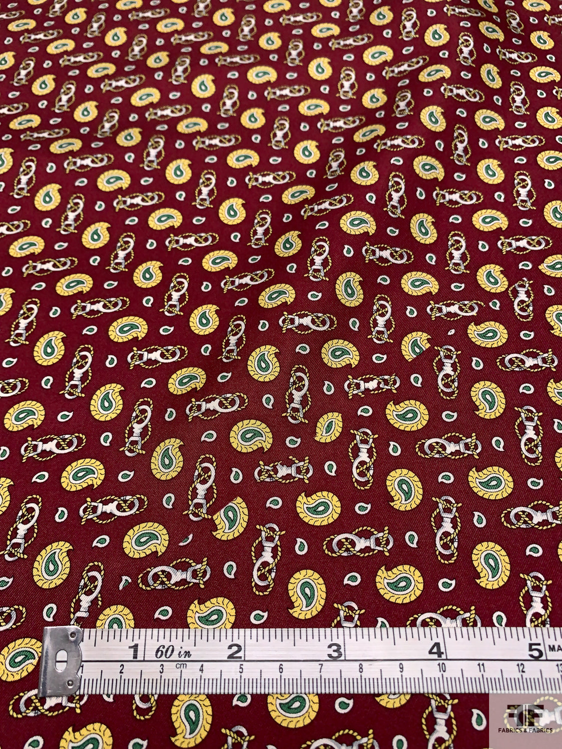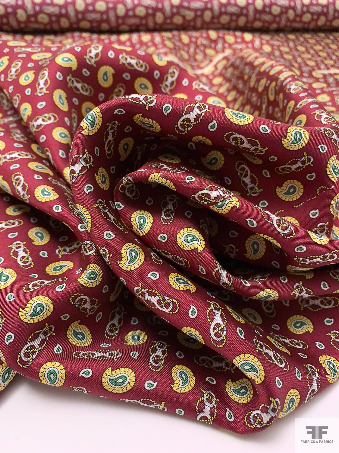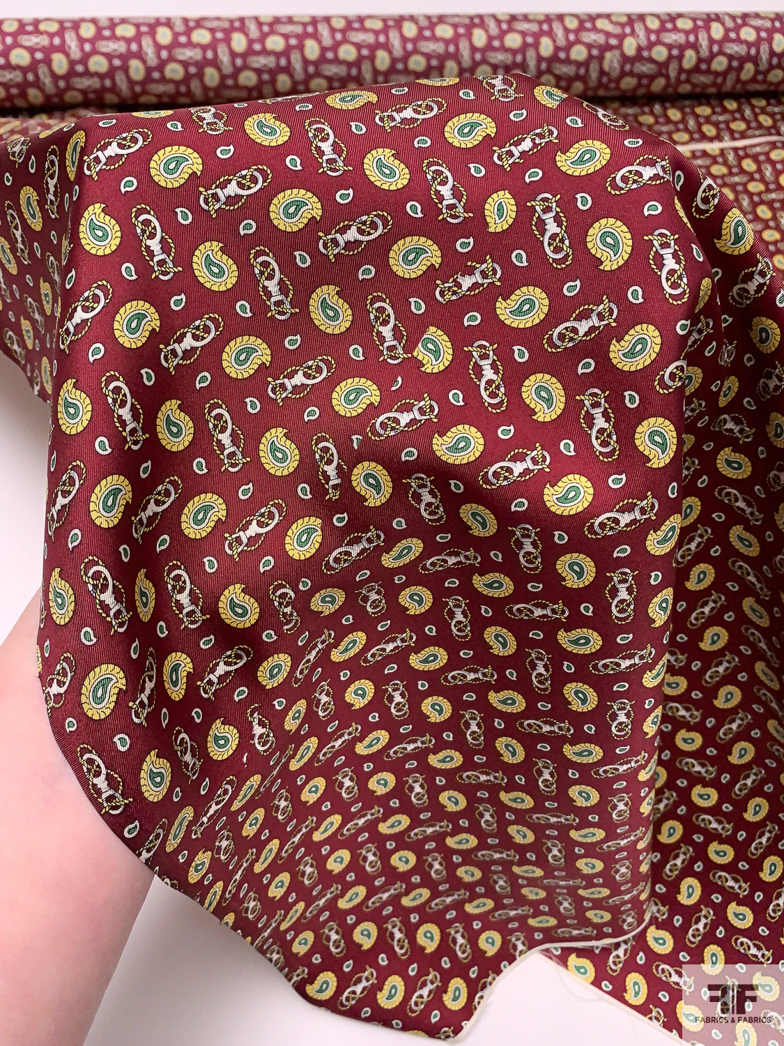 Nautical Paisley Printed Fine Silk Twill Panel - Dark Red / Pale Yellow / Sage