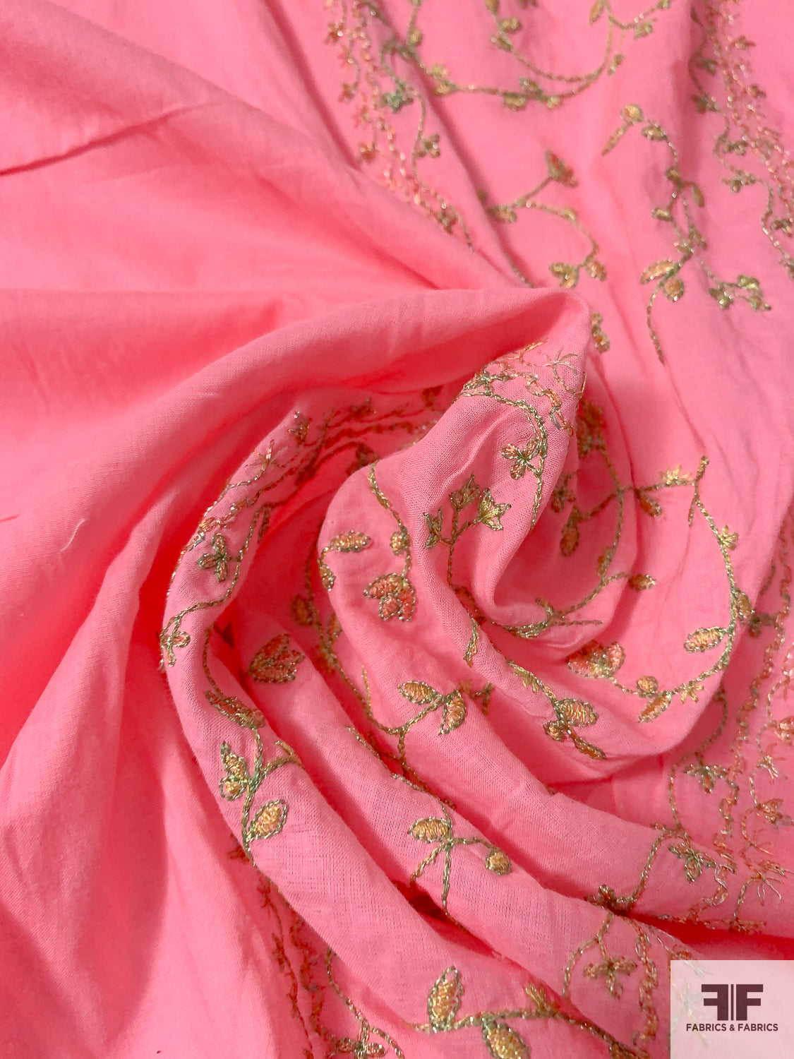 Ornate Leaf Vine Double-Border Metallic Embroidered Cotton Voile - Bubblegum Pink / Gold / Silver