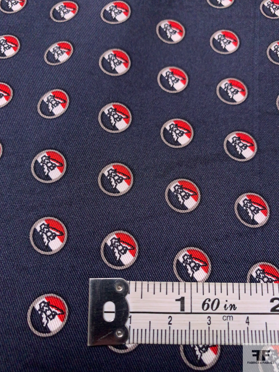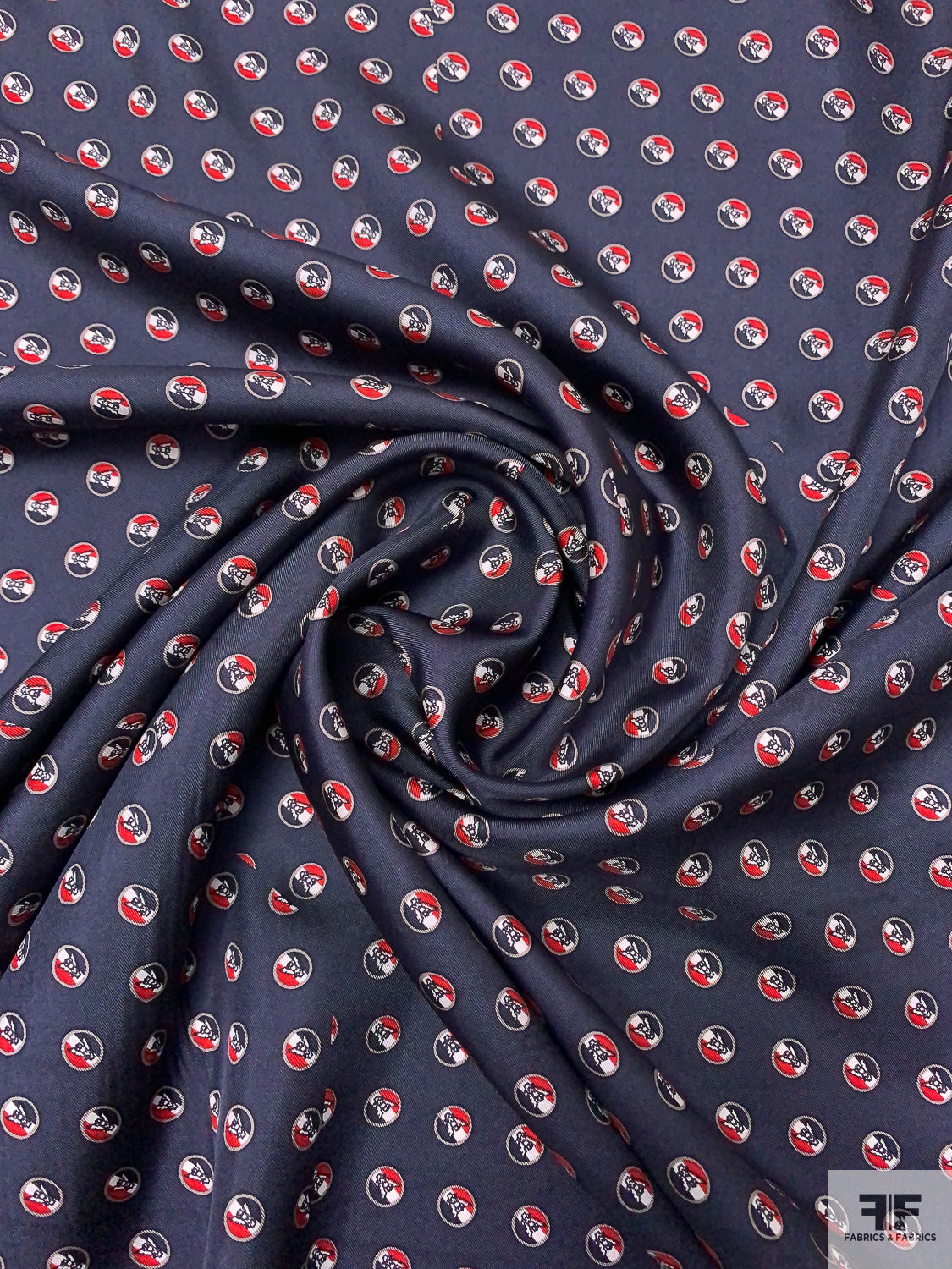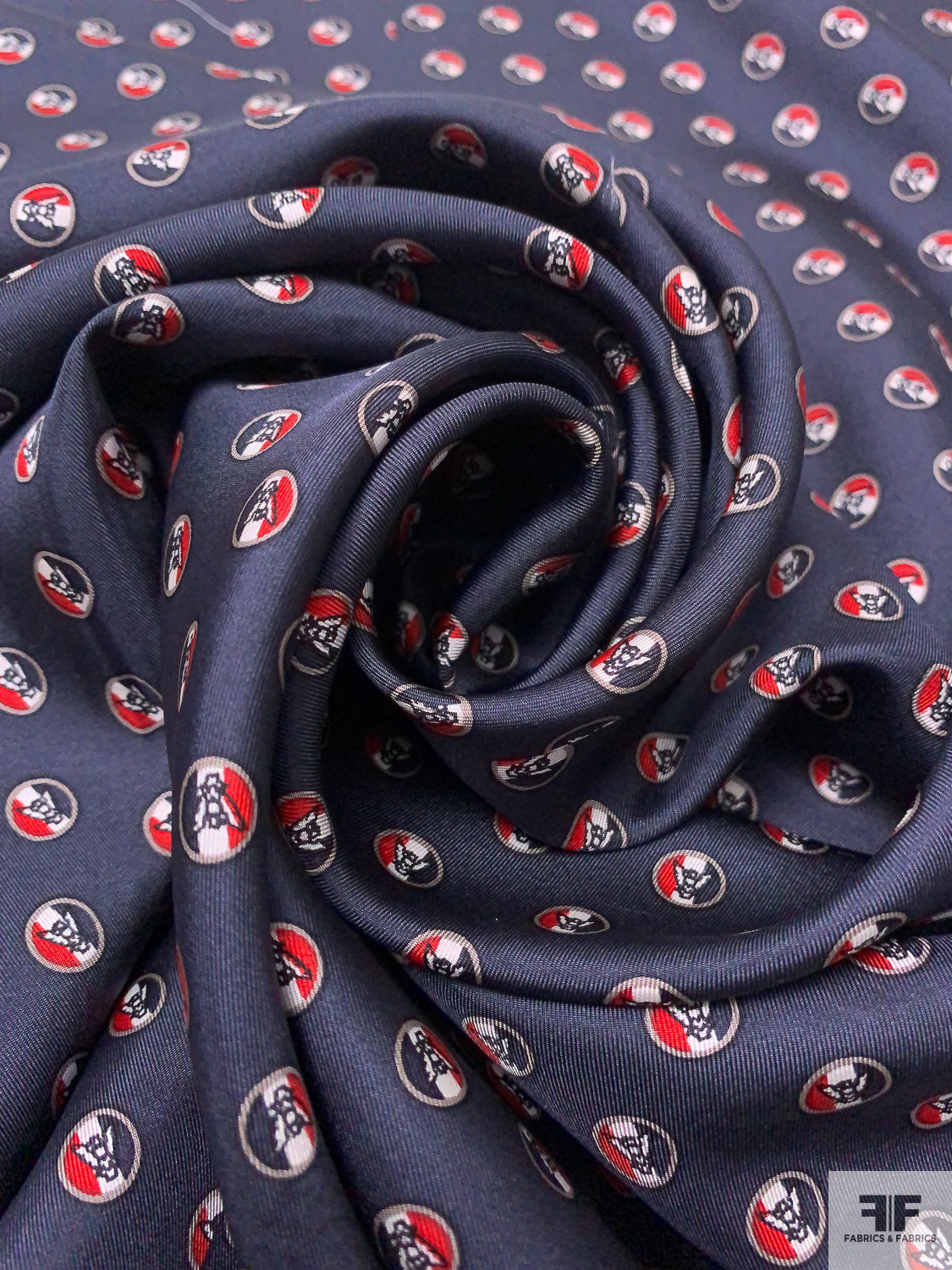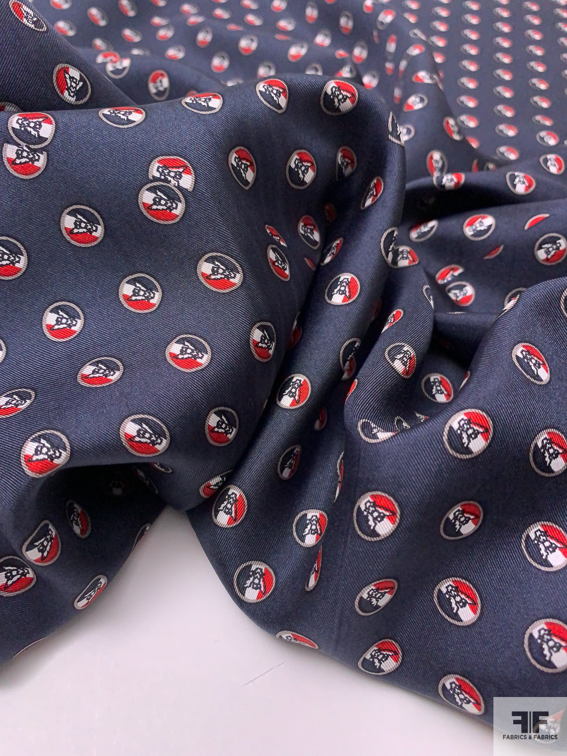 Owls in Circles Printed Silk Twill Panel - Navy / Red / White / Smokey Taupe