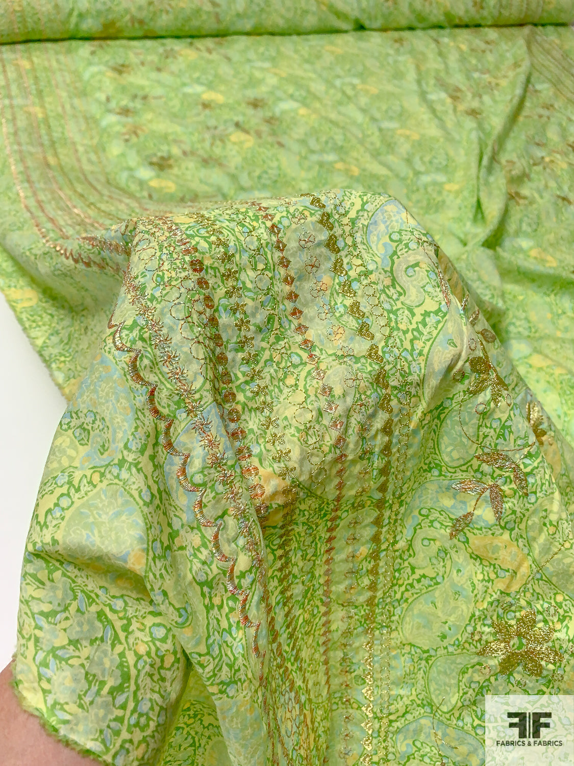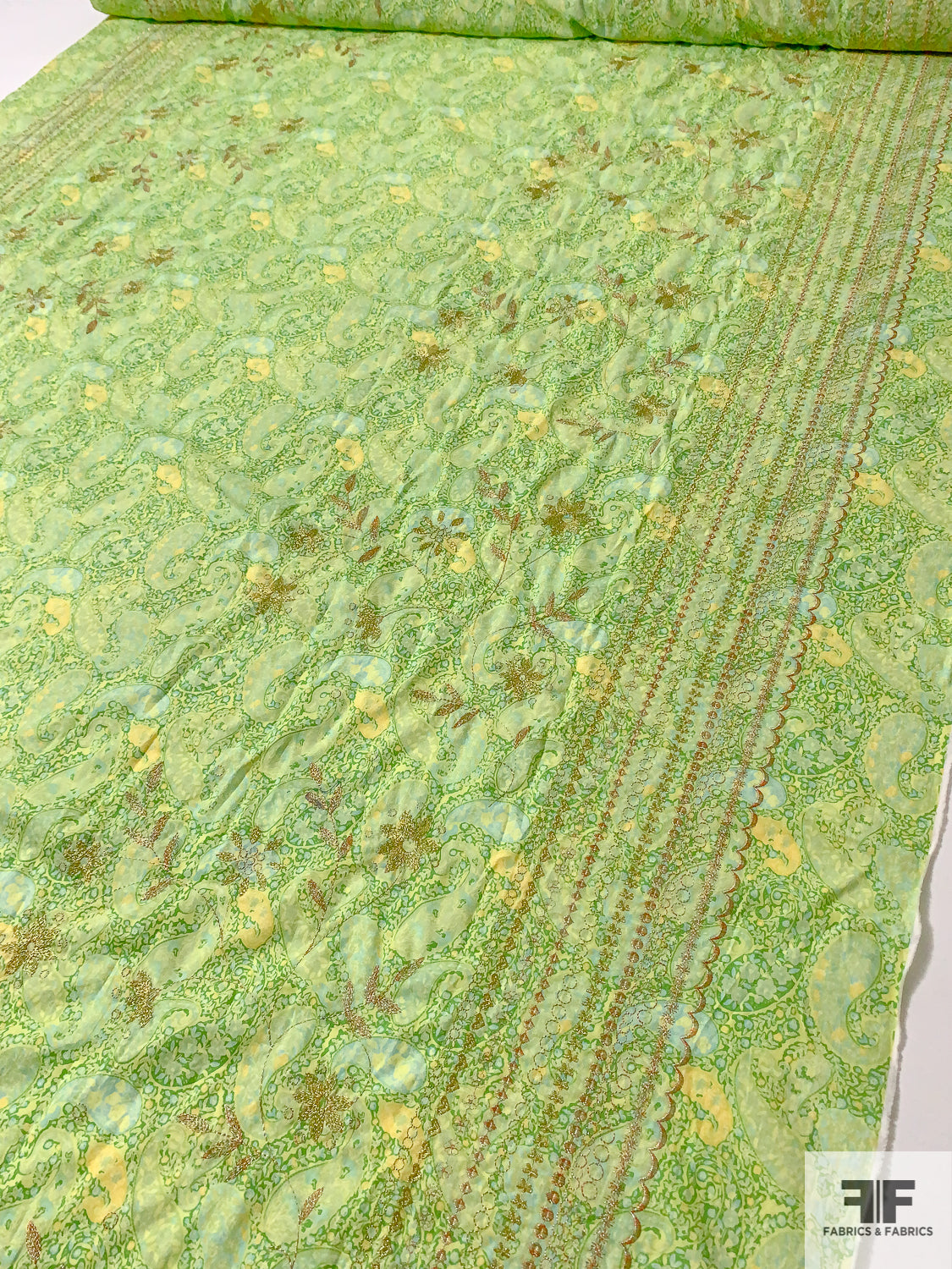 Paisley Printed Cotton Lawn with Gold Thread Embroidery - Shades of Green / Yellow / Gold