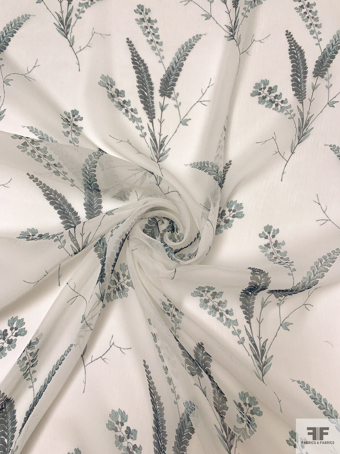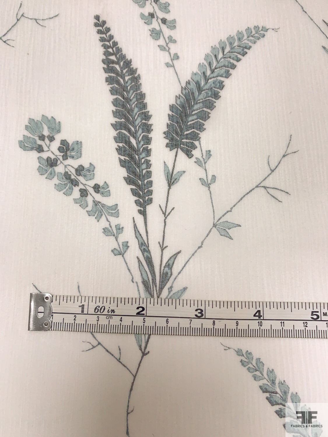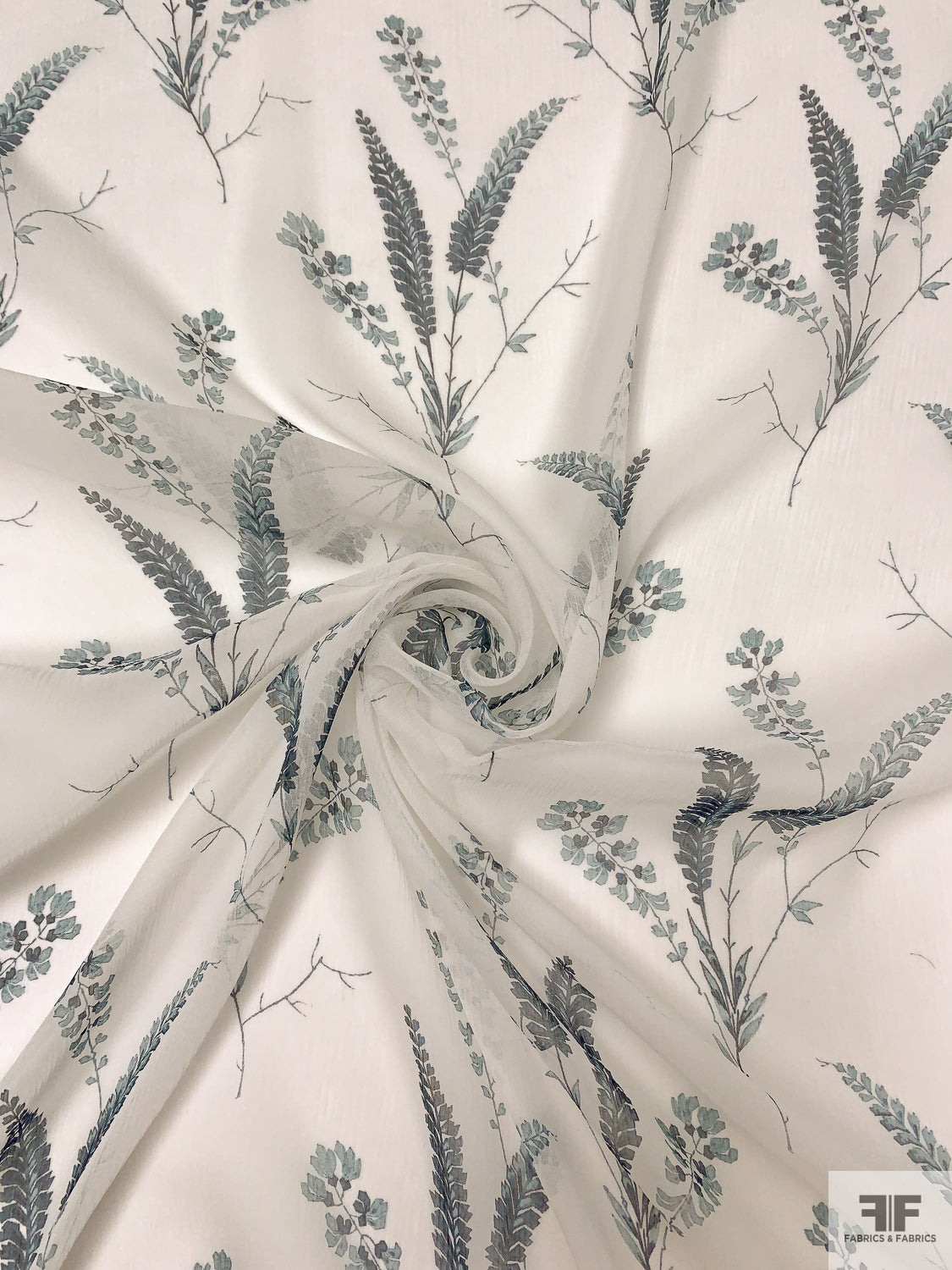Stalk Floral Printed Crinkled Silk Chiffon - Off-White / Dusty Teal