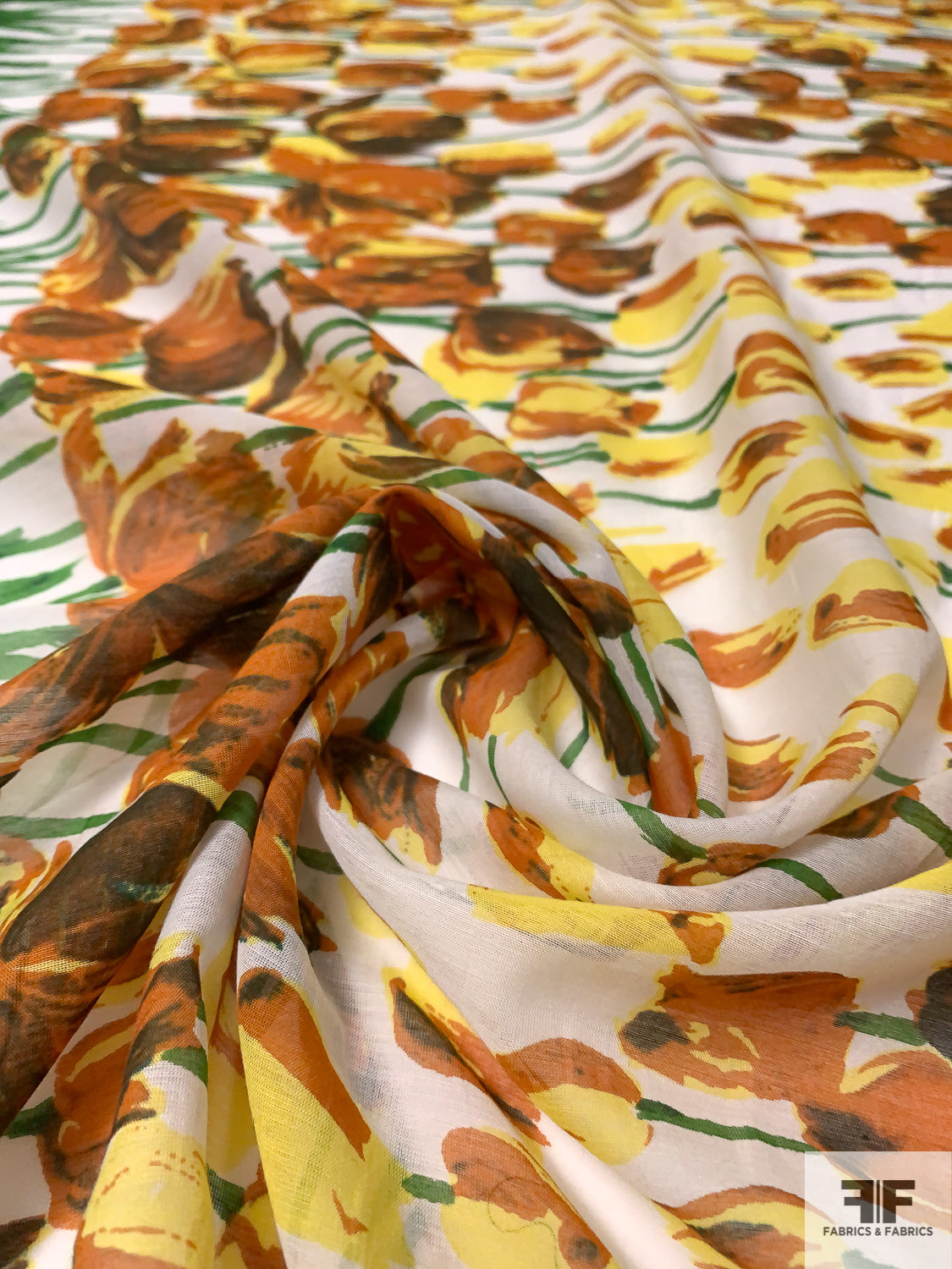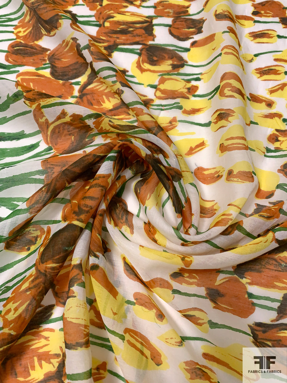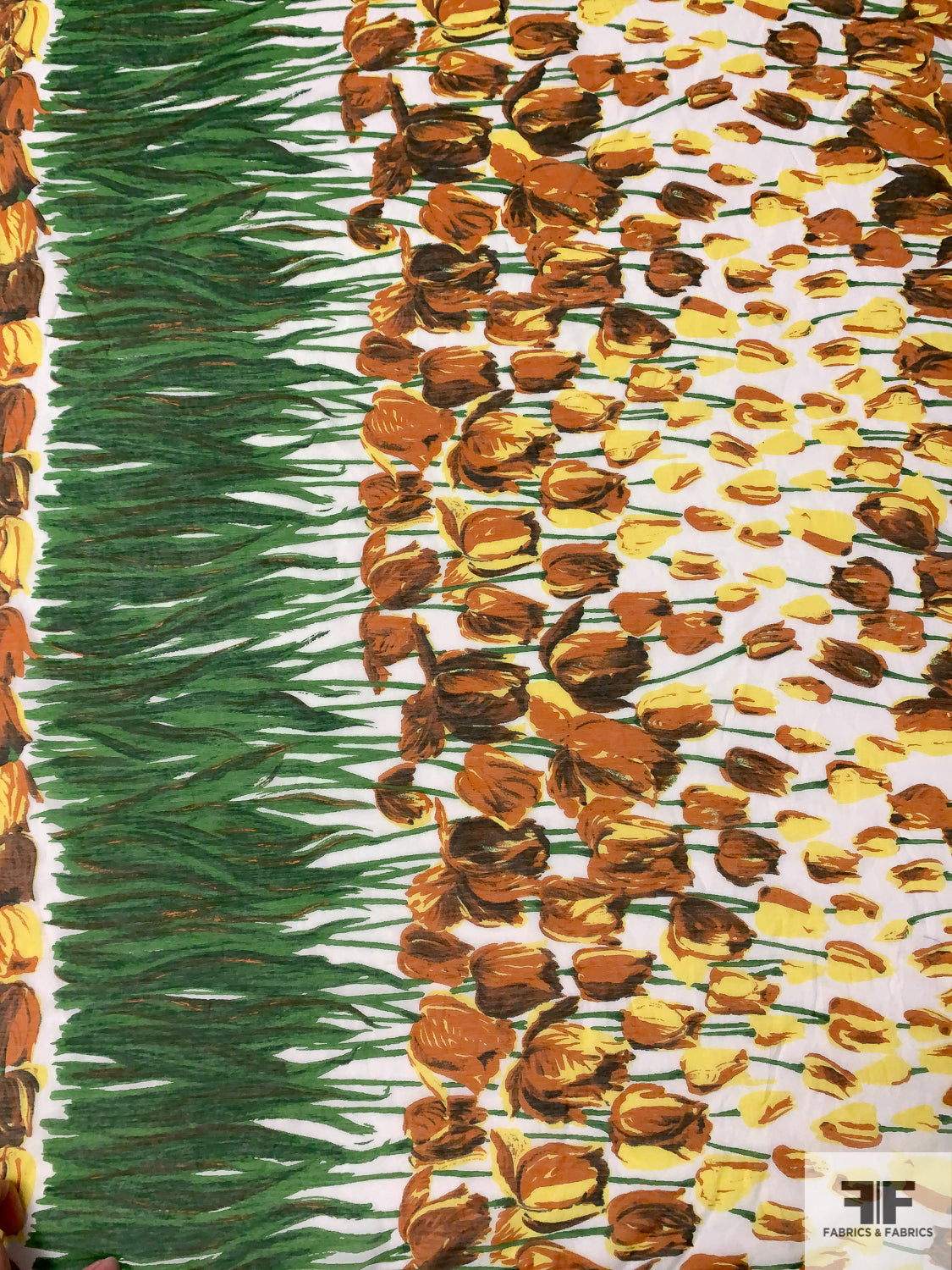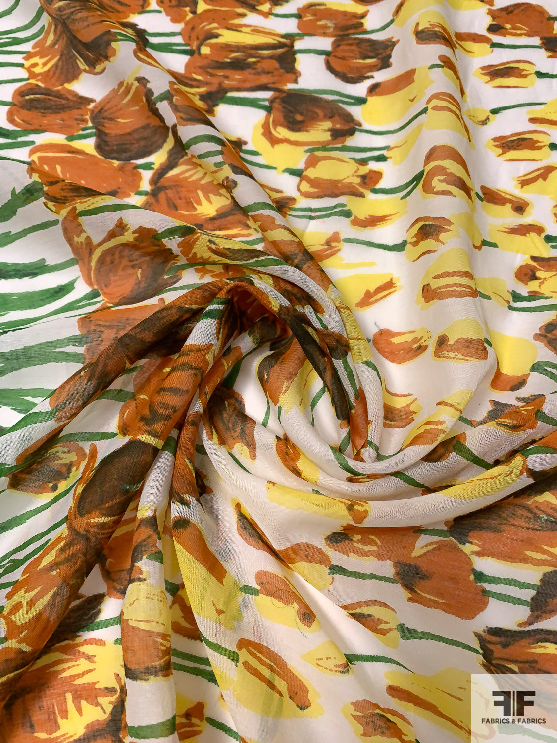 Tulip Garden Printed Cotton-Silk Voile - Green / Yellow / Browns / White